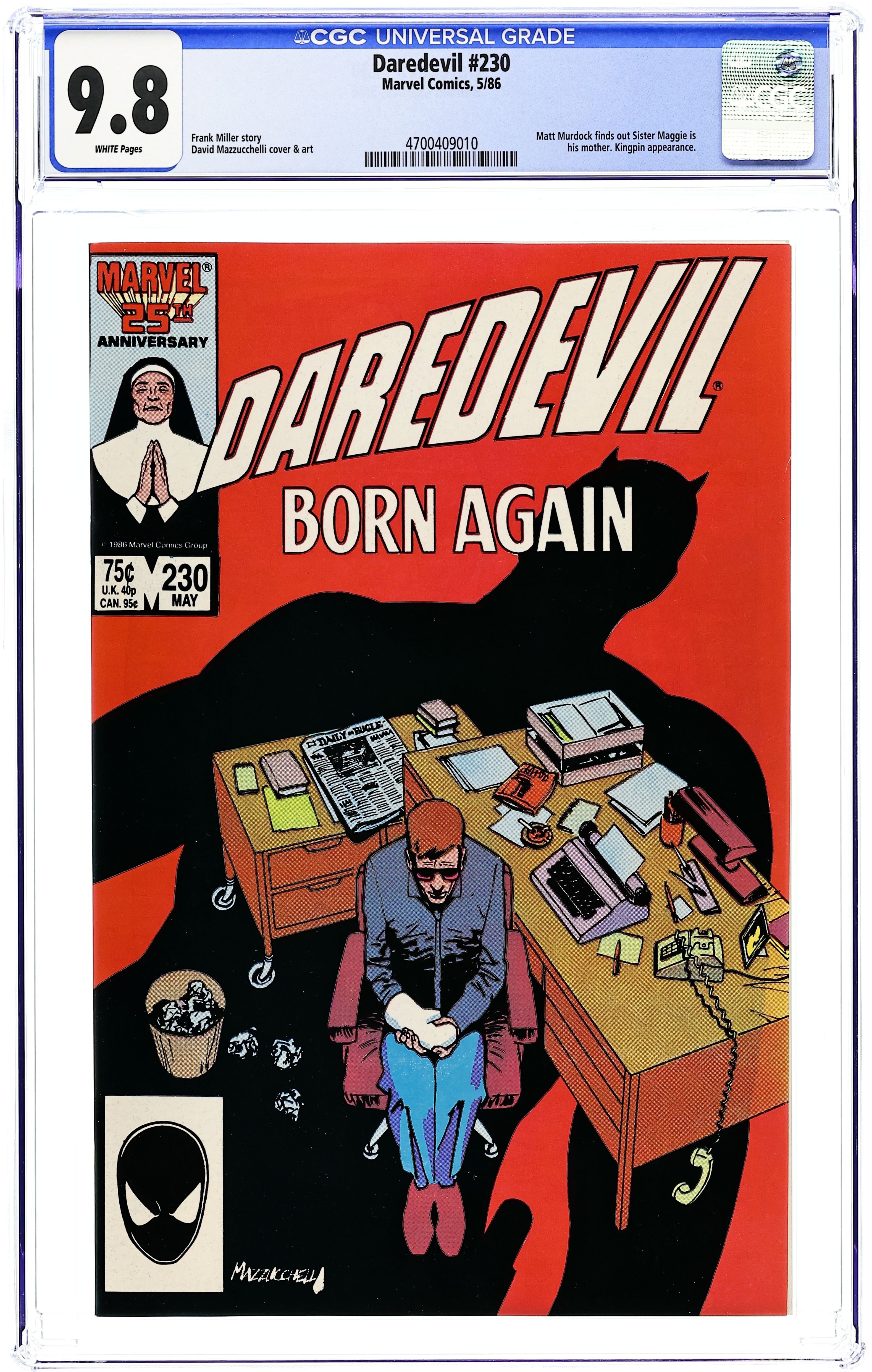 Direct Edition. "Saved" Written by Frank Miller. Art by David Mazzucchelli. Cover art by David Mazzucchelli. Ben begins his expose on the Kingpin and his wife is almost killed for his efforts. Matt fights the Kingpin's goon in a Daredevil costume and takes the costume after the battle. Matt and Karen are re-united. Part 5 of critically acclaimed Born Again storyline. Cover price $0.75.