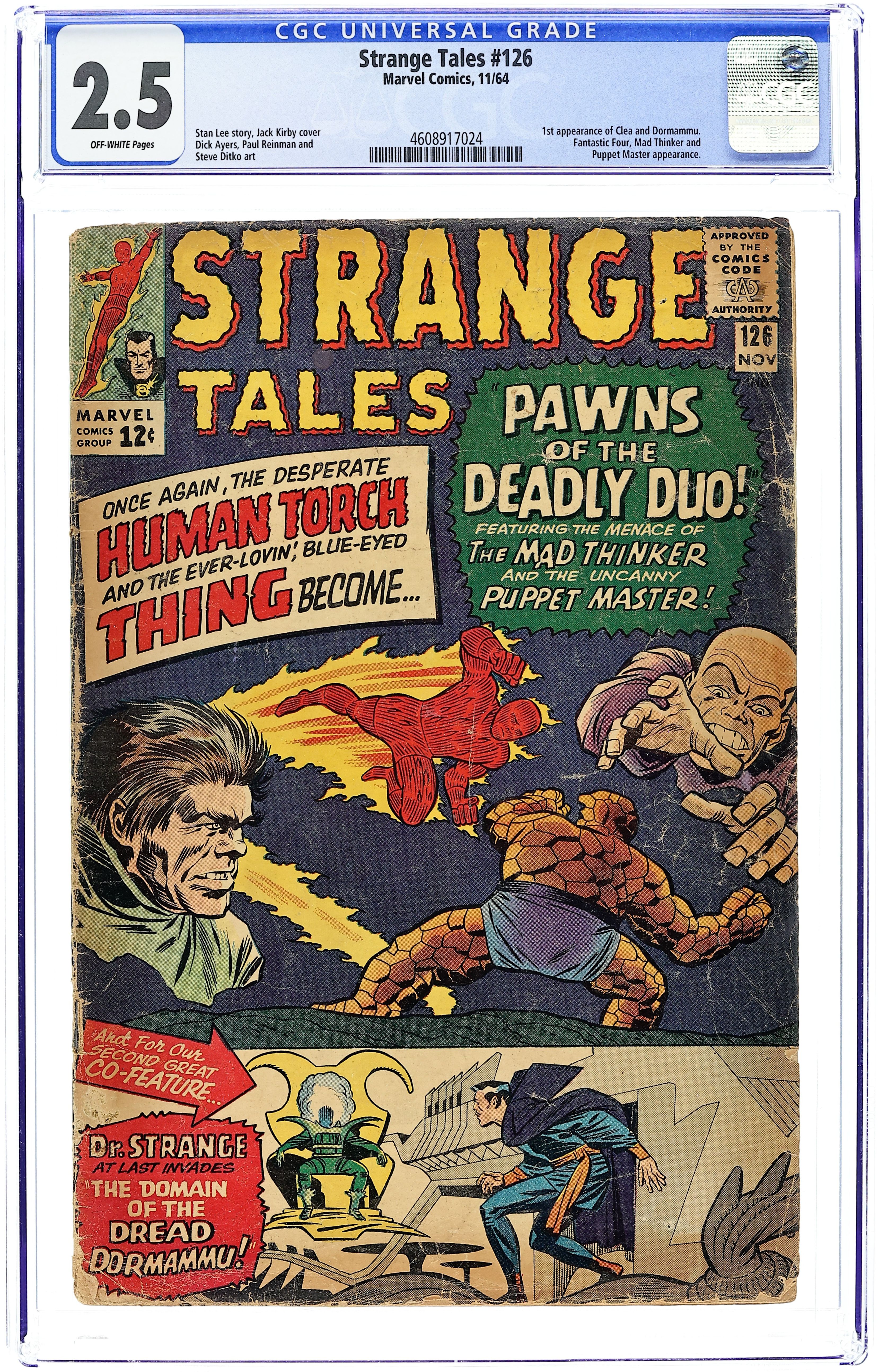 First appearance of Dormammu and Clea (named in issue 146). The Human Torch and the Thing face the Thinker and the Puppet Master in "Pawns of the Deadly Duo!" Script by Stan Lee, pencils by Dick Ayers, inks by Paul Reinman. Reed Richards and Sue Storm appearances. Doctor Strange stars in "The Domain of the Dread Dormammu!" Script by Lee, art by Steve Ditko. First letters page. Jack Kirby/Chic Stone cover. 36 pgs. Cover price $0.12.