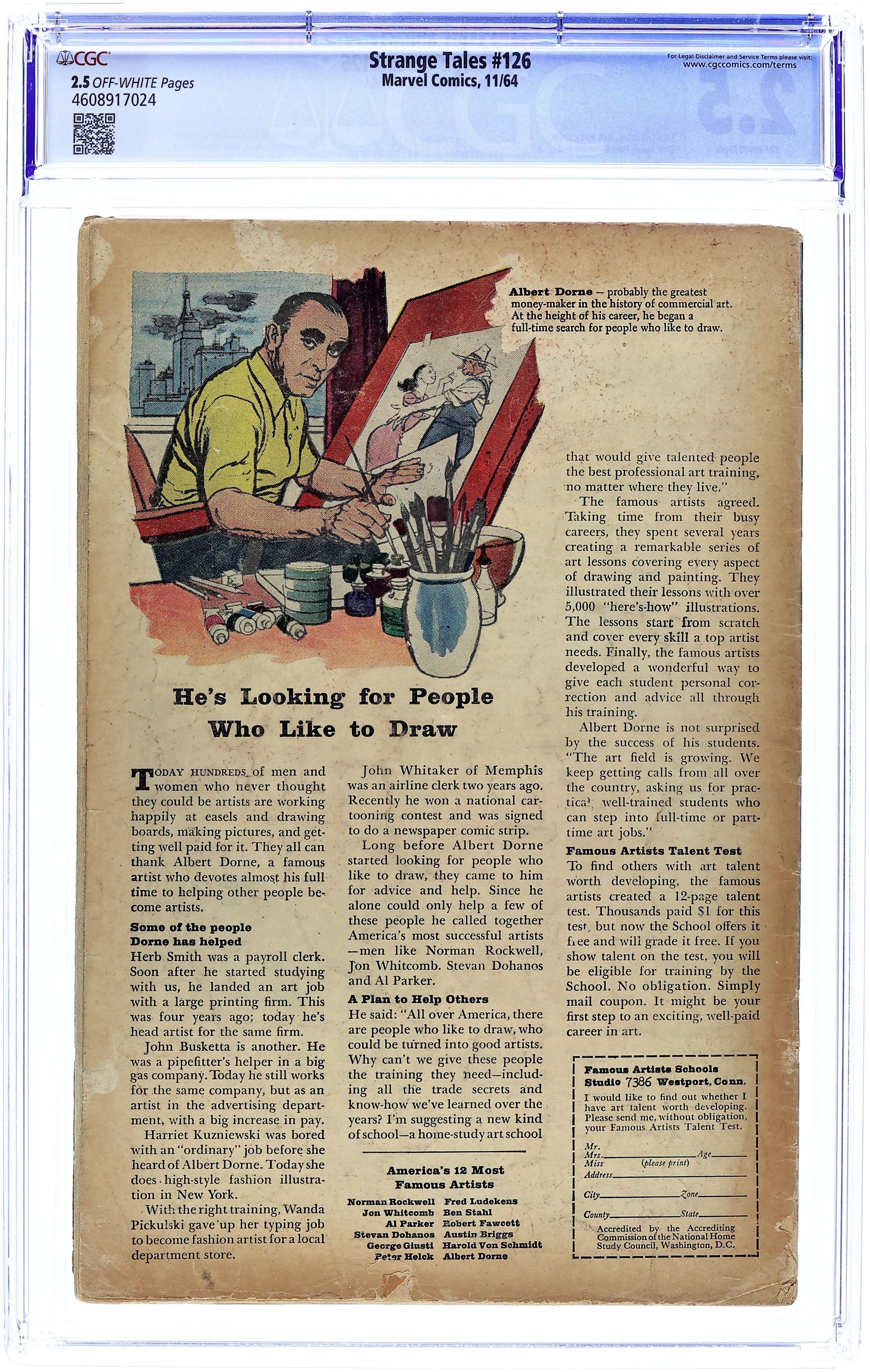 Cover pencils by Jack Kirby, inks by Sol Brodsky. The Human Torch and the Thing guest star in "Quicksilver and the Scarlet Witch," script by Stan Lee and Dick Ayers (co-plot), pencils by Dick Ayers, inks by Frank Giacoia (as Frank Ray); Quicksilver wants to leave Magneto's group but his sister Wanda reminds him that she is in his debt; The Scarlet Witch takes her brother's lead and they seek out the Fantastic Four for advice; They encounter Ben and Johnny at FF headquarters where a misunderstanding turns into a brawl; Cameos by the X-Men (Angel, Cyclops, Marvel Girl, and Iceman), Magneto, the Mastermind, the Blob, and the Yancy Street Gang. Dr. Strange Master of the Mystic Arts illustration by Steve Ditko. "The Demon's Disciple!", script by Steve Ditko (plot, uncredited) and Stan Lee (dialogue), art by Steve Ditko; Dr. Strange receives a desperate plea for help from a man who became a disciple of someone called The Demon, not realizing the seriousness of the situation; The Demon transports the man back to his lair and consigns him to a pit beneath the floor; Strange tracks the man's location and confronts the evil mystic in an epic battle. 36 pgs., full color. Cover price $0.12.