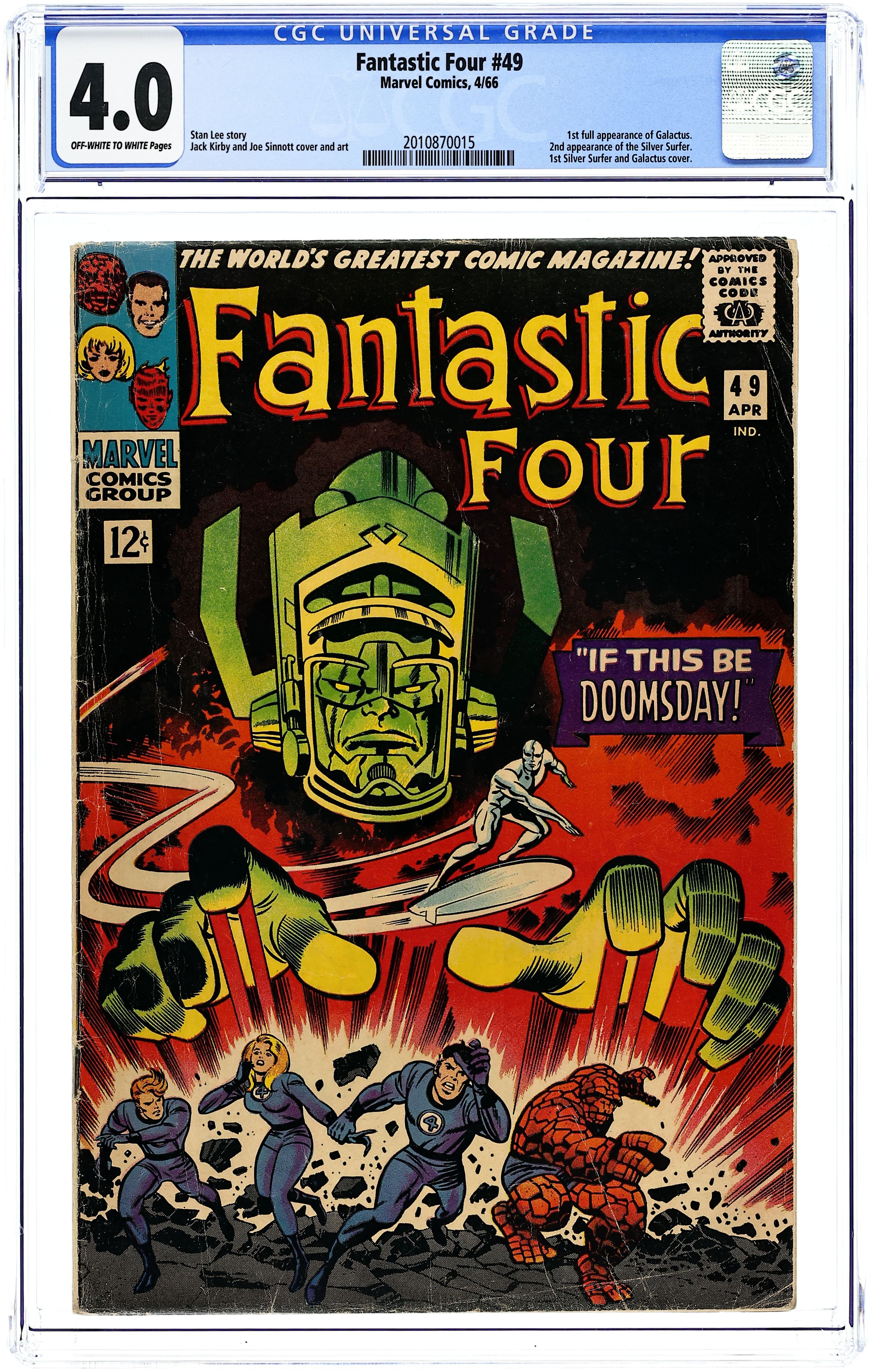 Cover pencils by Jack Kirby, inks by Joe Sinnott. Second appearances of Galactus and the Silver Surfer (First cover appearance for both) in If This Be Doomsday!, script by Stan Lee, pencils by Jack Kirby, inks by Joe Sinnott; The Fantastic Four try to slow Galactus while the Watcher takes the Human Torch to find a weapon to defeat Galactus; Alicia Masters convinces Silver Surfer to help humanity. Letter to the editor from comic artist Dave Cockrum. 36 pgs. $0.12. Cover price $0.12.