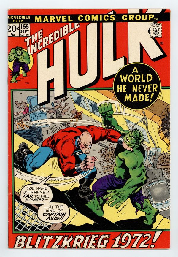 Starts Apr 27 Cover pencils by Herb Trimpe, inks by John Severin. Destination: Nightmare!, script by Archie Goodwin, pencils by Herb Trimpe, inks by John Severin; Thanks to Hank Pym's experimental shrinking serum, Hulk travels through the microverse until he finds himself on a world very similar to his own Earth but one in which the Nazis are still fighting the Allies in World War II; He discovers that the scenario is really a construct created by the Shaper of Worlds to fulfill the dreams of an ex-Nazi who arrived during an experiment with Dr. Doom; In order to stop the Hulk, the Shaper turns Kronsteig into the powerful Captain Axis but Hulk still beats him; The Shaper decides to fulfill the Hulk's own dream and sends him to Jarella's world. 36 pgs. $0.20. Cover price $0.20.