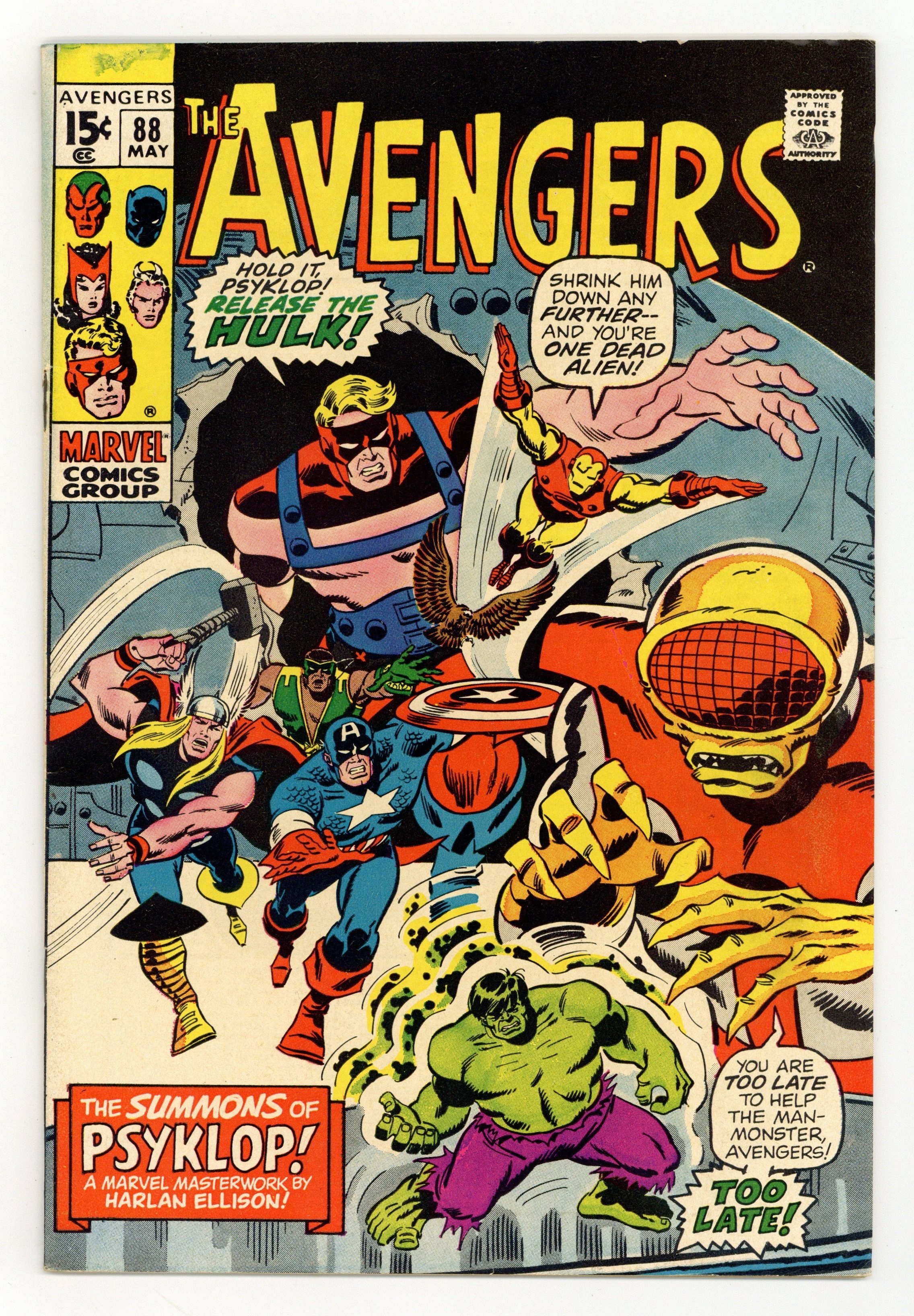 Starts Apr 27 1st Printing. "The Summons of Psyklop" Part 1 of 2. Guest-starring Mr. Fantastic, the Falcon, Professor X, and the Hulk. Plot by Harlan Ellison. Script by Roy Thomas. Pencils by Sal Buscema. Inks by Jim Mooney. Cover by Sal Buscema. General Ross has imprisoned the Hulk at Boulder Dam! And now with help from Mr. Fantastic, the Green Goliath is prepared for loading into a coma-crypt for safekeeping! But during the transfer, a bizarre alien named Psyklop kidnaps the gamma-radiated behemoth! Meanwhile on a supposedly deserted pacific atoll, four avengers and the Falcon are following a lead on a voodoo cult...when they stumble across Psyklop and the Hulk! What a coincidence! The Avengers quickly attack! But Psyklop slips away and the Hulk fades away! Where on Earth did they go? Story continues in Incredible Hulk 140. Cameo appearance by Professor Xavier. Avengers Lineup: Black Panther, Captain America, Goliath, Iron Man, Quicksilver, Scarlet Witch, Thor, and the Vision. (Notes: The letters page of Avengers 92 details the development of this two-part adventure. This story was reprinted in Marvel Superheroes 90.) 36 pages. NOTE: 1994 JC Penney reprint exists. Can be identified by having a Stridex ad on the back cover. Cover price $0.15.