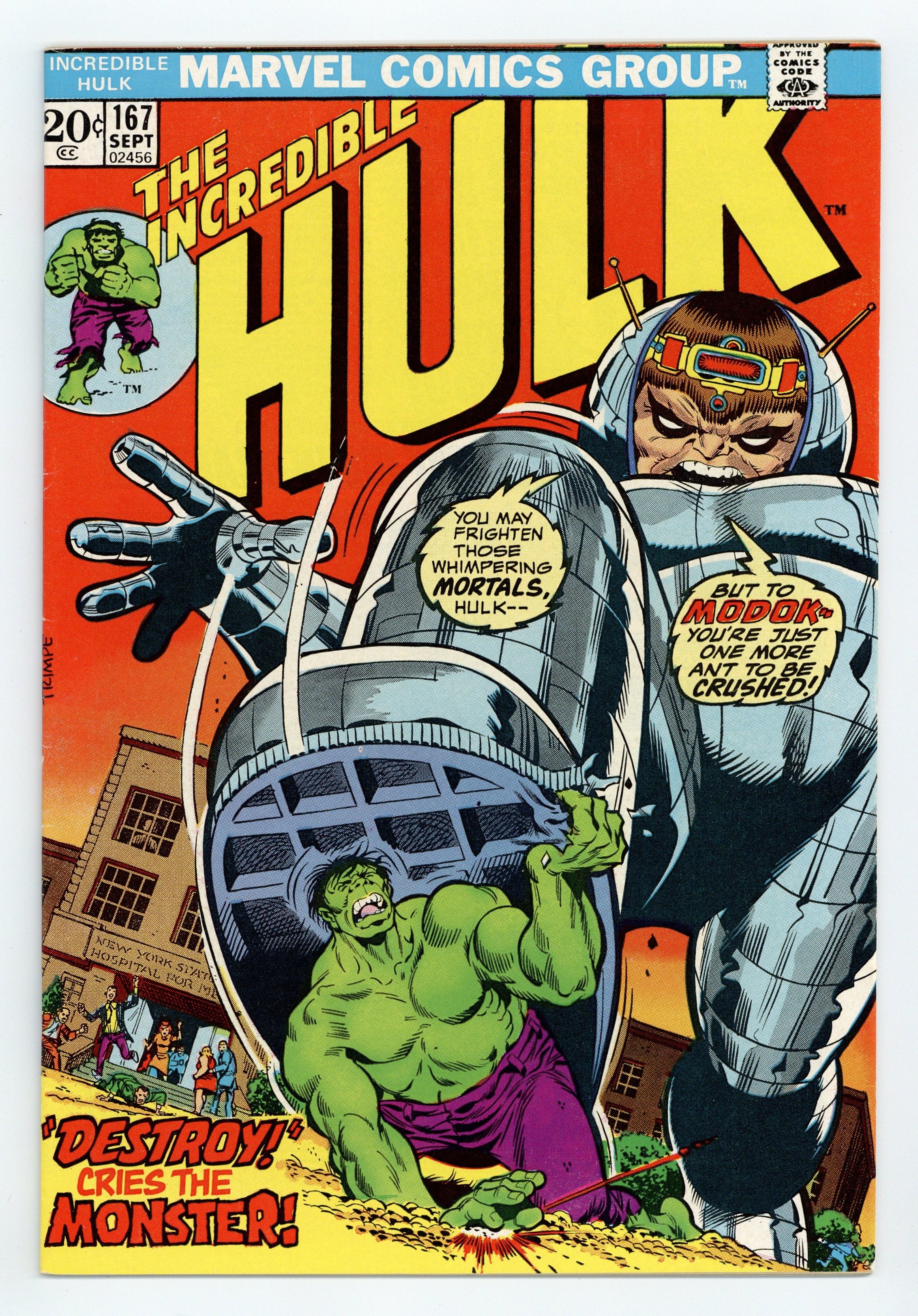Starts Apr 27 Cover art by Herb Trimpe. To Destroy the Monster!, script by Steve Englehart, pencils by Herb Trimpe, inks by Jack Abel; Ross returns from Russia and is forced to tell Betty that her husband died saving his life; Betty's mind snaps and she is committed to a sanitarium; Bruce visits Betty to see if he can help but she rants at him as well, beating on him until he turns into the Hulk; Realizing that Betty hates the Hulk, M.O.D.O.K. decides to use her as his instrument of vengeance. The story continues from Defenders 11 and Marvel Feature 11. 36 pgs. $0.20. Cover price $0.20.