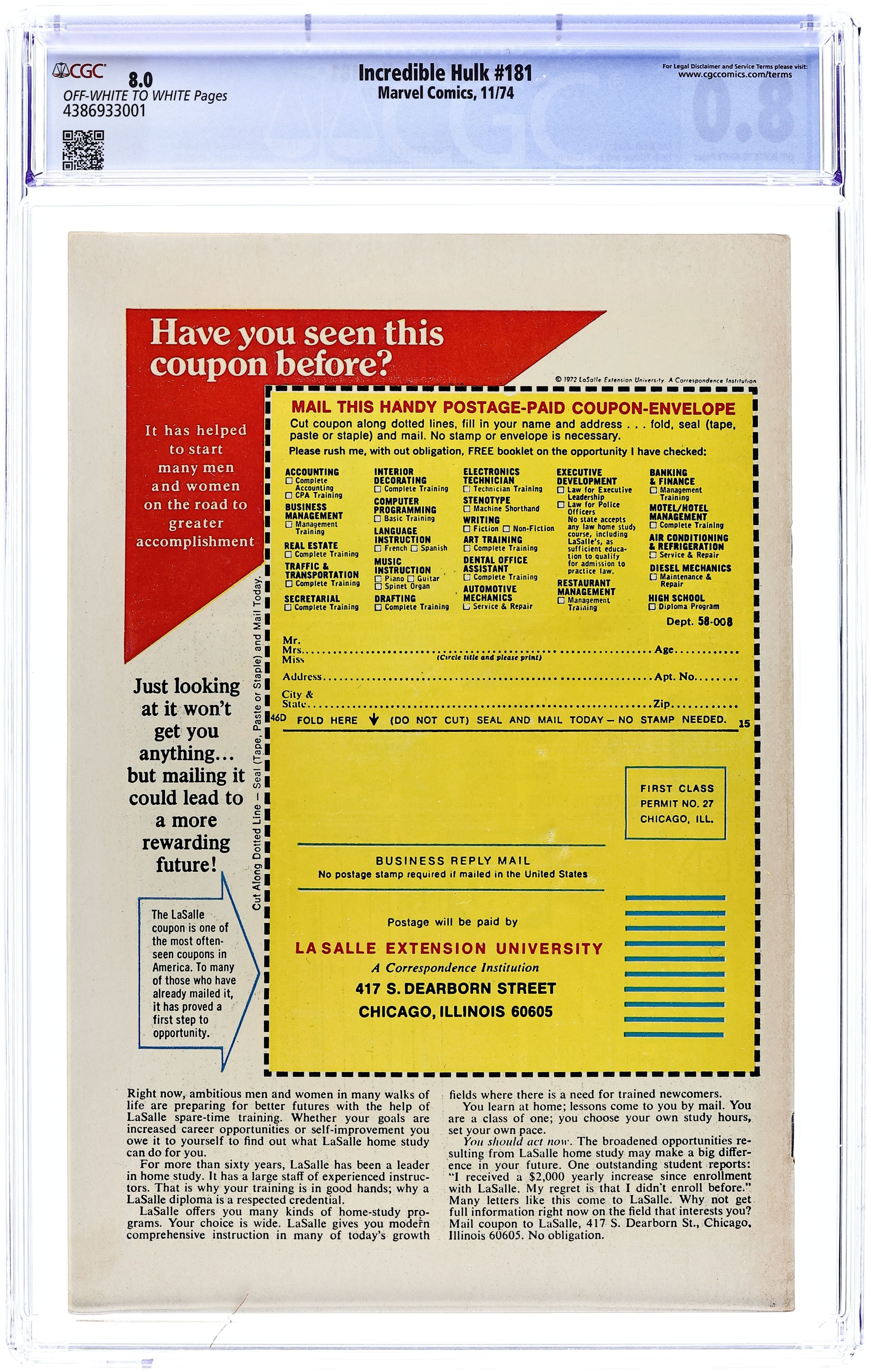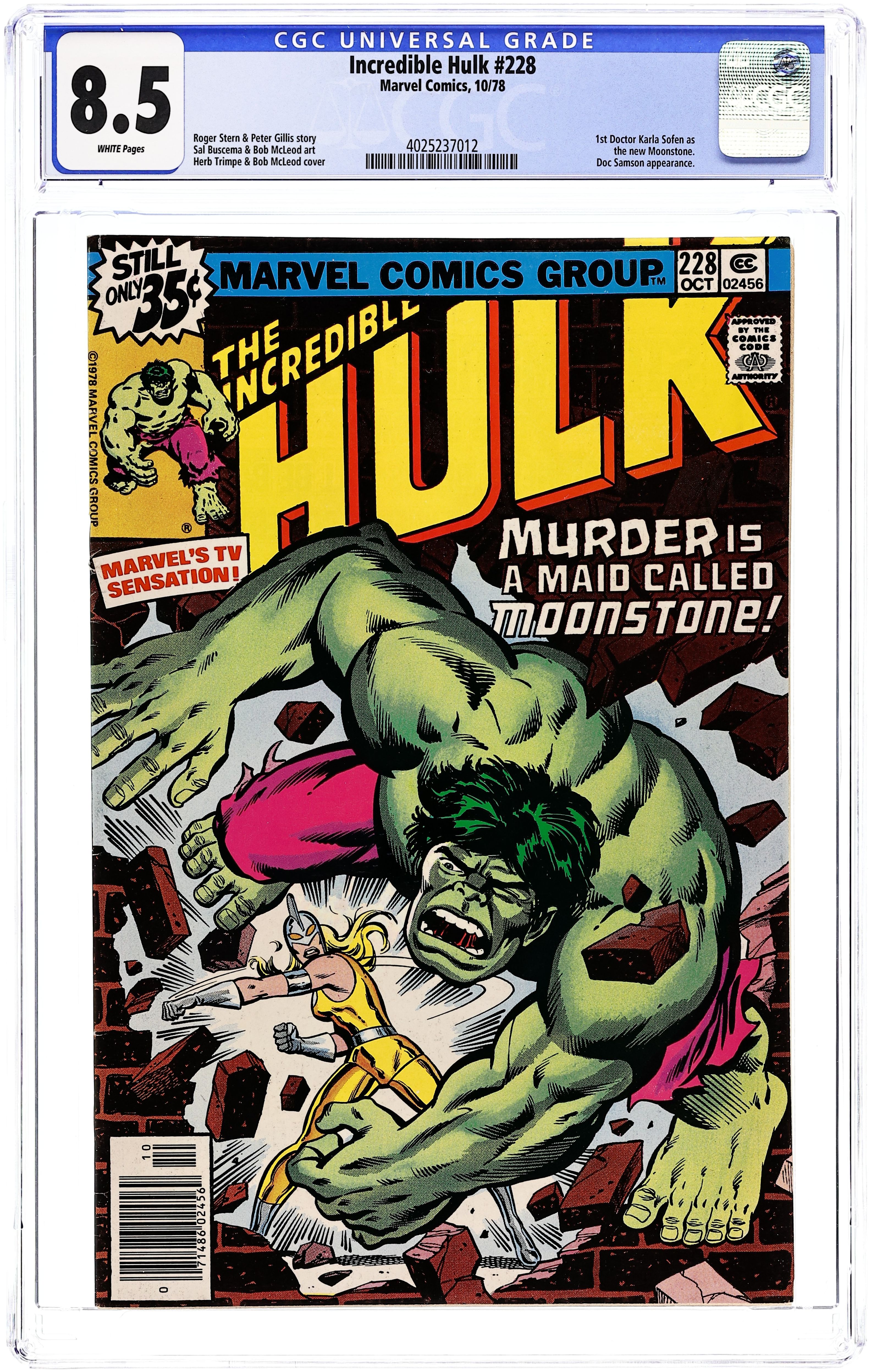 Cover by Ernie Chan. "Big Monster on Campus!", script by Roger Stern, pencils by Sal Buscema (breakdowns) and Joe Sinnott (finished art), inks by Joe Sinnott; Hulk punches Doc Samson away and leaps from Gamma base; After a while, Ol'Greenskin reaches Desert State University, college where Bruce Banner attended; Some of Banner's memories bother him immensely; Extremely confused, Hulk unloads his anger against a Socrates statue which reads 'Know thyself'; As the giant picks up the statue's head, he turns into Banner crying; Bruce wonders who he really is; And Doc Samson shows up offering his professional help. 36 pgs., full color. $0.35. Cover price $0.35.