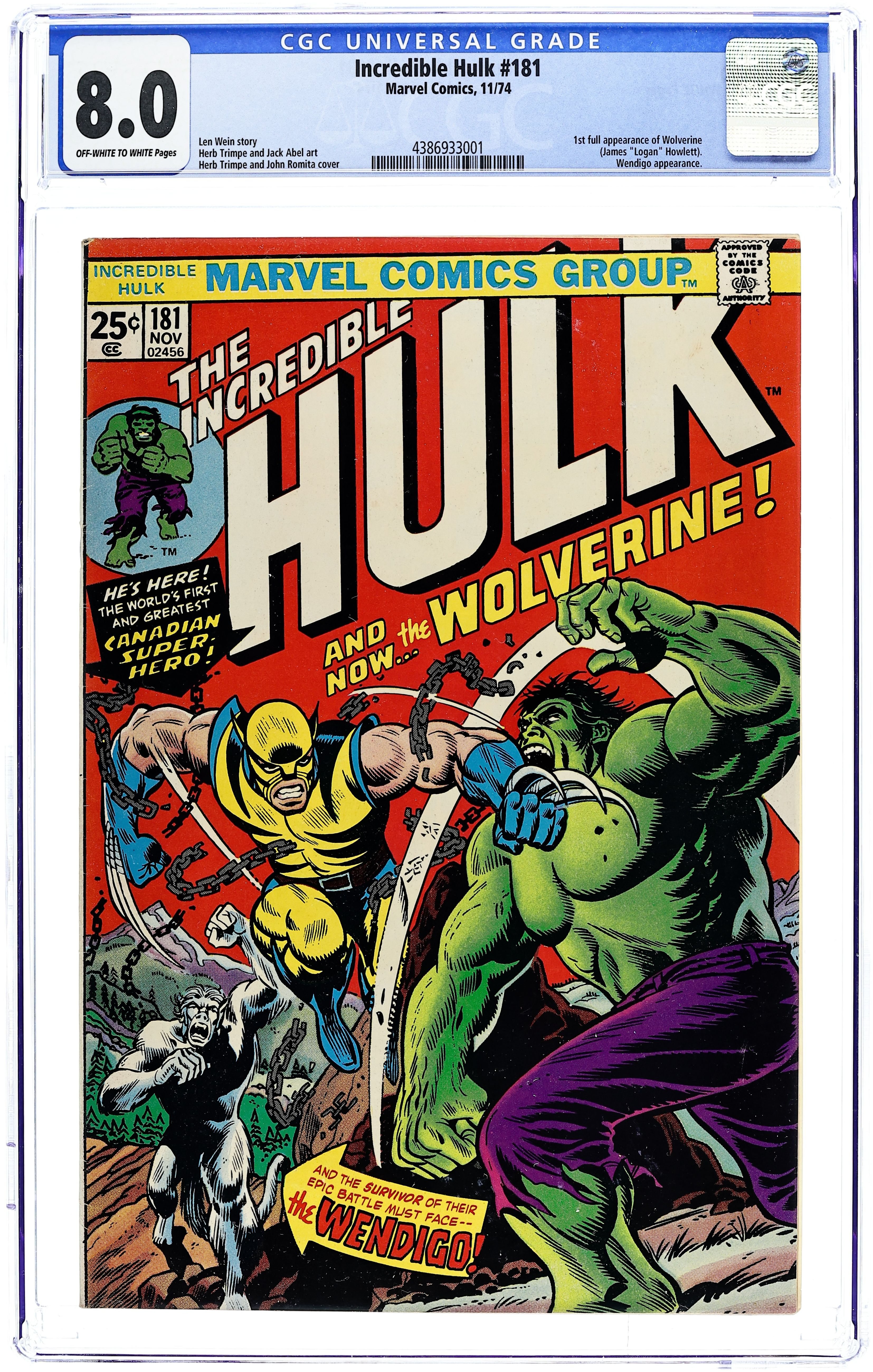 First appearance of Wolverine (cameo last panel). Cover art by Herb Trimpe. And the Wind Howls...Wendigo!, script by Len Wein, pencils by Herb Trimpe, inks by Jack Abel; Hulk is in Canada looking for some peace and quiet when he is mysteriously drawn to a cave inhabited by the sister of the man who became the Wendigo; Marie and Georges plan on transferring the power of the Wendigo to the Hulk, thus restorin Paul Cartier to his normal life; Marie's magic isn't strong enough, however, and just as Wendigo shows up, the Hulk wakes up from his magical slumber and the two battle; The Canadian government gets involved and sends in their own agent to take care of a recent Hulk sighting, the mutant known as Wolverine. Marvel Value Stamp Series A (Cyclops). 36 pgs. $0.25. Cover price $0.25.