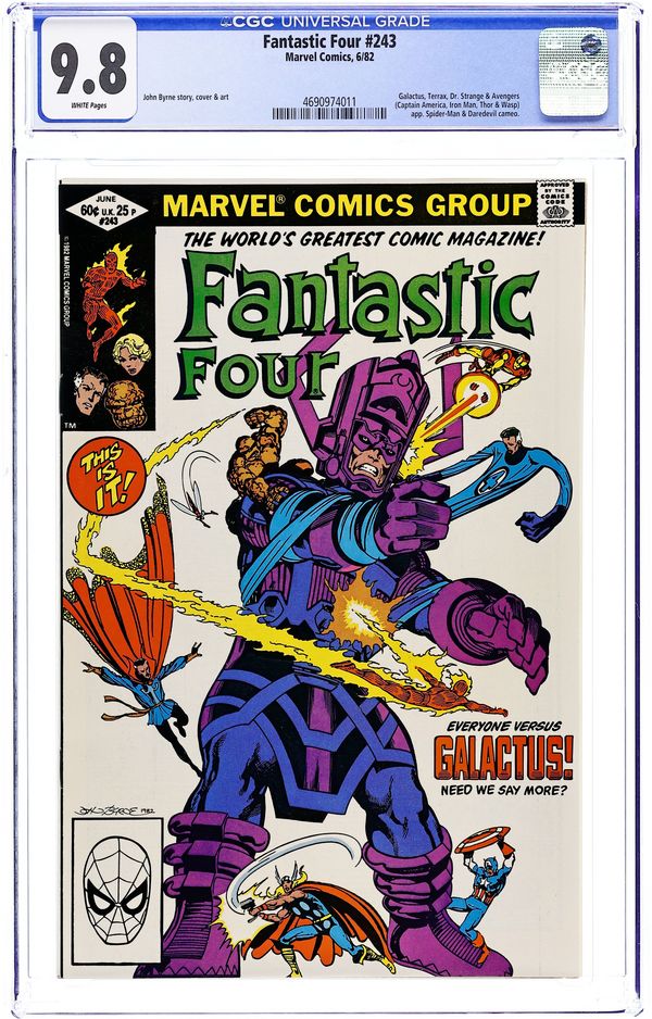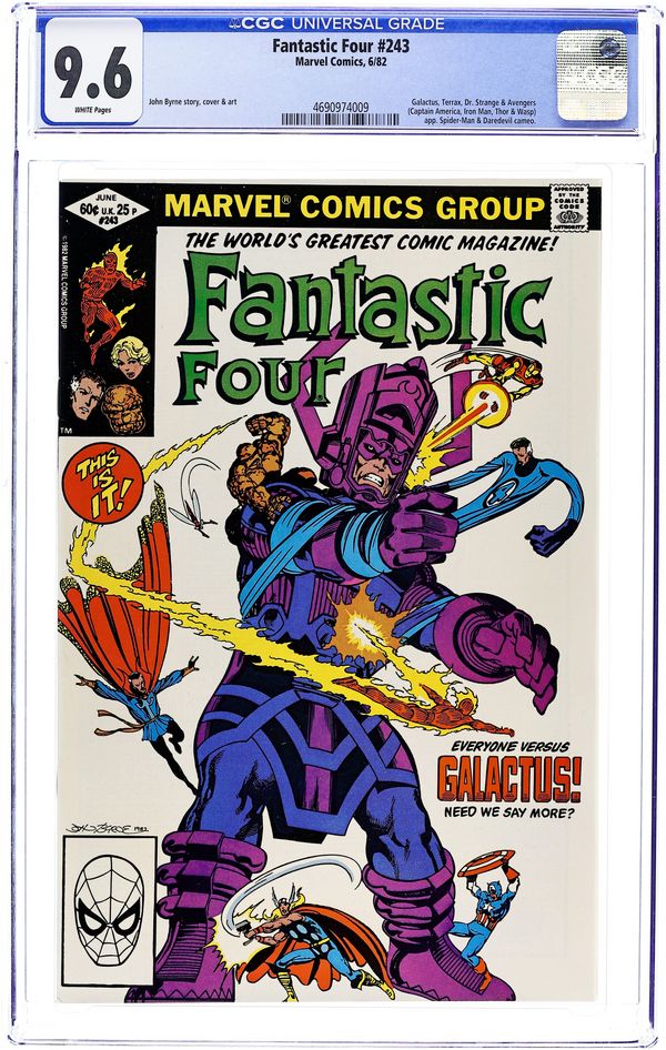 Direct Edition. "Beginnings and Endings" Part 3 of 3. Script and Art by John Byrne. Cover by John Byrne. After an unprecedented victory over Galactus, the Avengers and the Fantastic Four face a major ethical decision: should they try to save the Ravager of Worlds or let him perish as his energies dwindle? Reed decides on the former and constructs a giant machine to revitalize Galactus! However, the Devourer of Worlds needs one more thing to complete his recovery...a new herald! In a stunning move, Frankie Raye volunteers! So where does that leave the Human Torch? First appearance of Nova (aka Frankie Raye). Cameo appearances by Captain America, Iron Man, Thor, Wasp, and Doctor Strange. (Notes: This trilogy was reprinted in 1989 in the trade paperback titled "Fantastic Four: Trial of Galactus." Reed's decision to save Galactus will come back to haunt the FF beginning in Fantastic Four 257.) 36 pages Cover price $0.60.