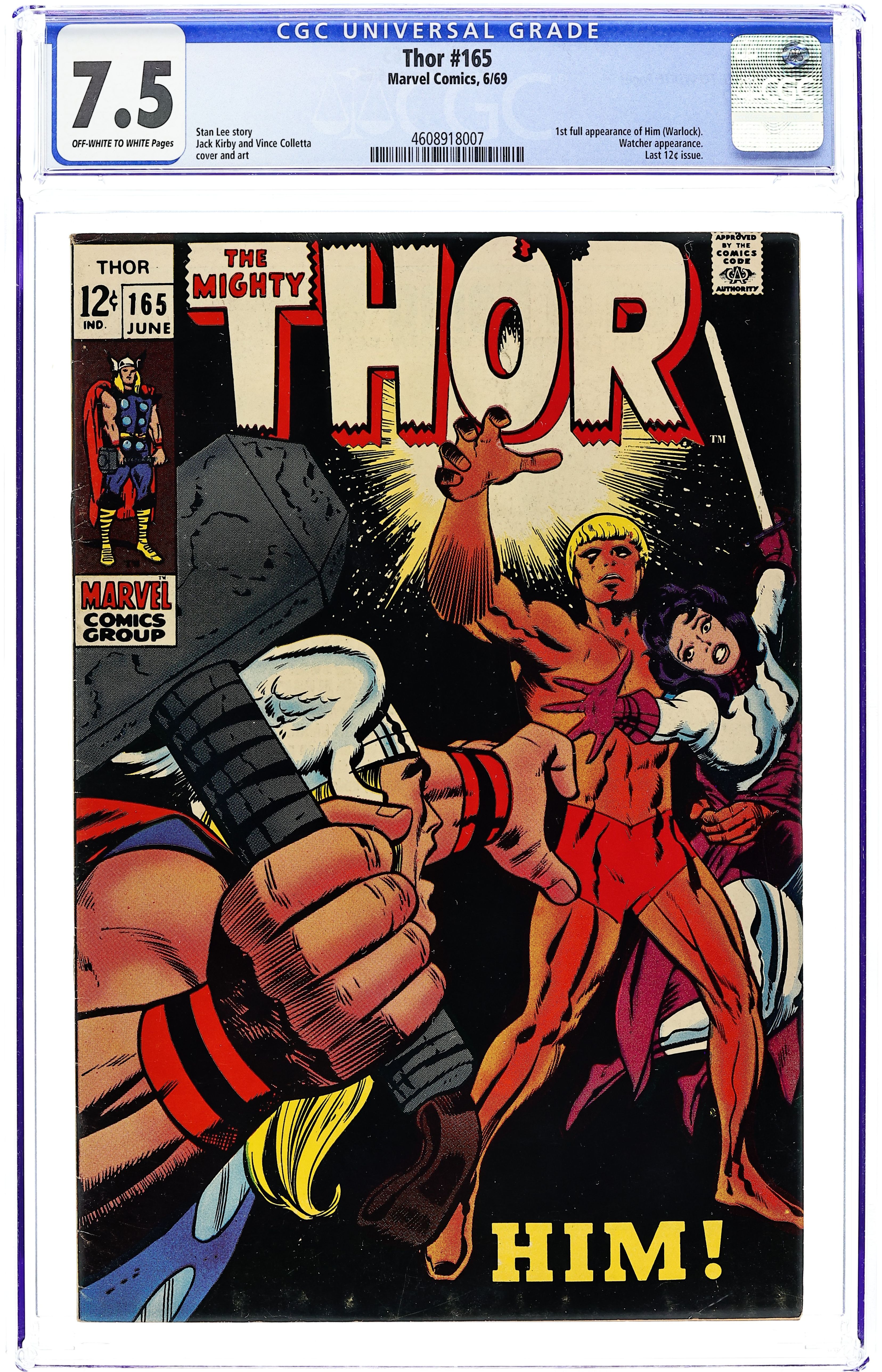 First 15-cent cover price. Cover pencils by Jack Kirby and John Romita (alterations), inks by Vince Colletta and John Romita (alterations). Second Adam Warlock appearance ("Him") in "A God Berserk!", script by Stan Lee, pencils by Jack Kirby, inks by Vince Colletta; After Adam Warlock takes off with Sif, Thor picks up his hammer and starts swinging!; A battle of brawn and rage ensues between two divine beings!; Will Thor fully succumb to the ailment Asgardians call "Warrior Madness?"; After a previous hiccup, Karnilla recovers her plot to gain Balders love; What sorcery does Haag have up her sleeve this time? 36 pgs., full color. NOTE: 2nd Appearance of Adam Warlock ("HIM"). Cover price $0.15.