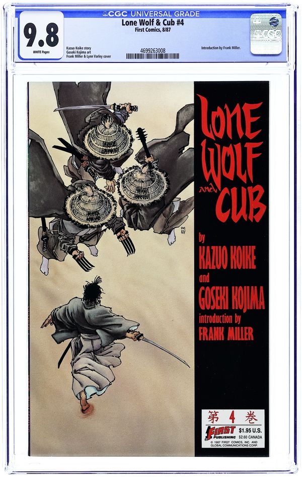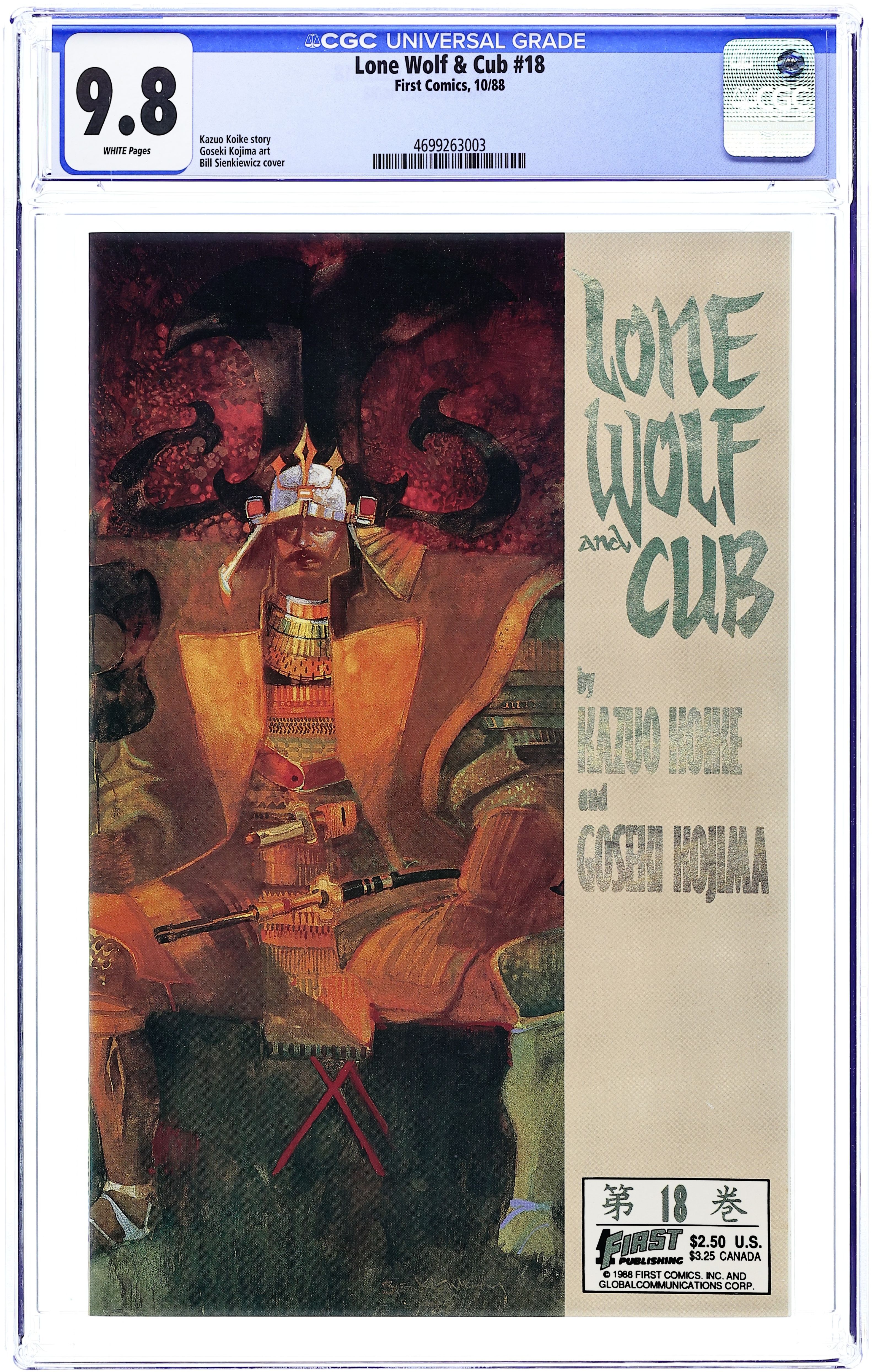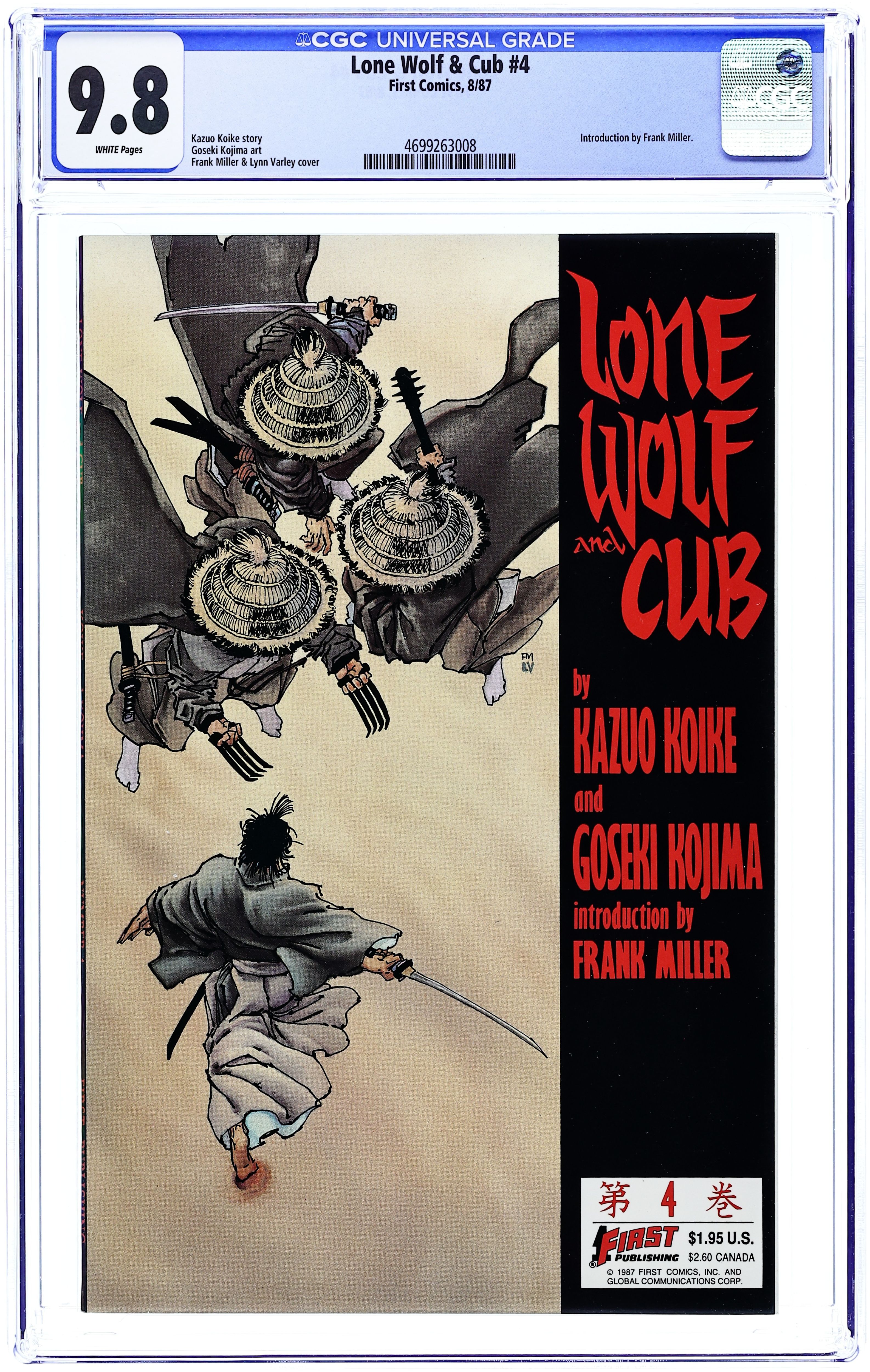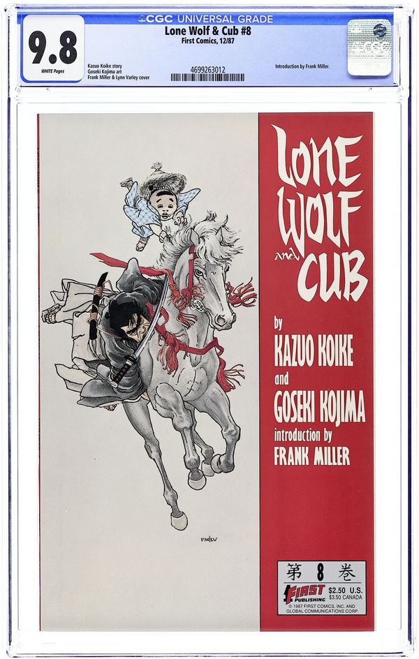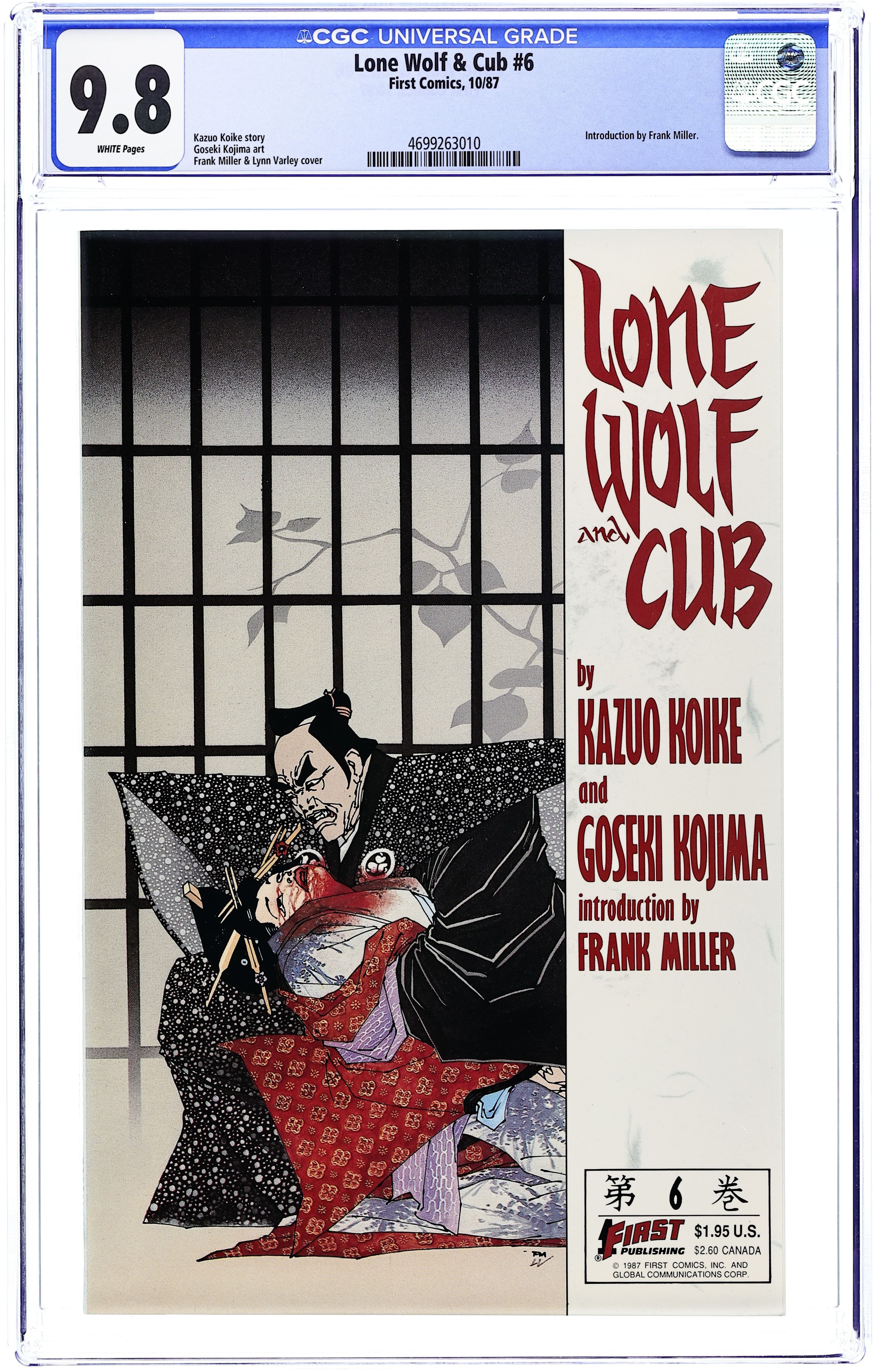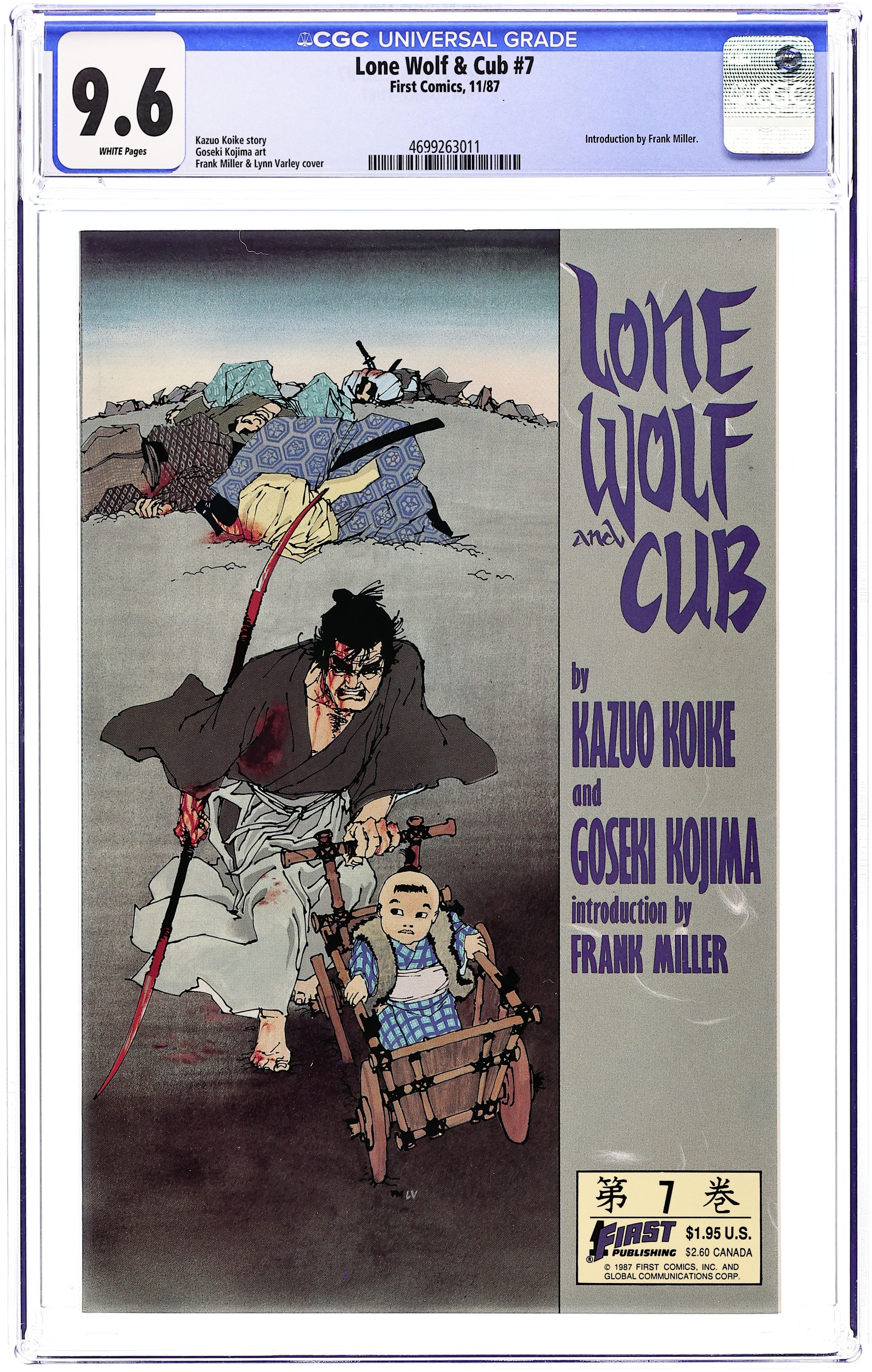 First printing. Frank Miller introduction and cover. Wrongfully accused of plotting to overthrow the Shogun, Itto Ogami becomes an outlaw, wandering through the provinces of feudal Japan, seeking vengeance for the murder of his wife and family. Awesome stories by Kazuo Koike and Goseki Kojma, presented in fantastic black and white art. Each issue in this series runs approximately 60 pages. Cover price $1.95.