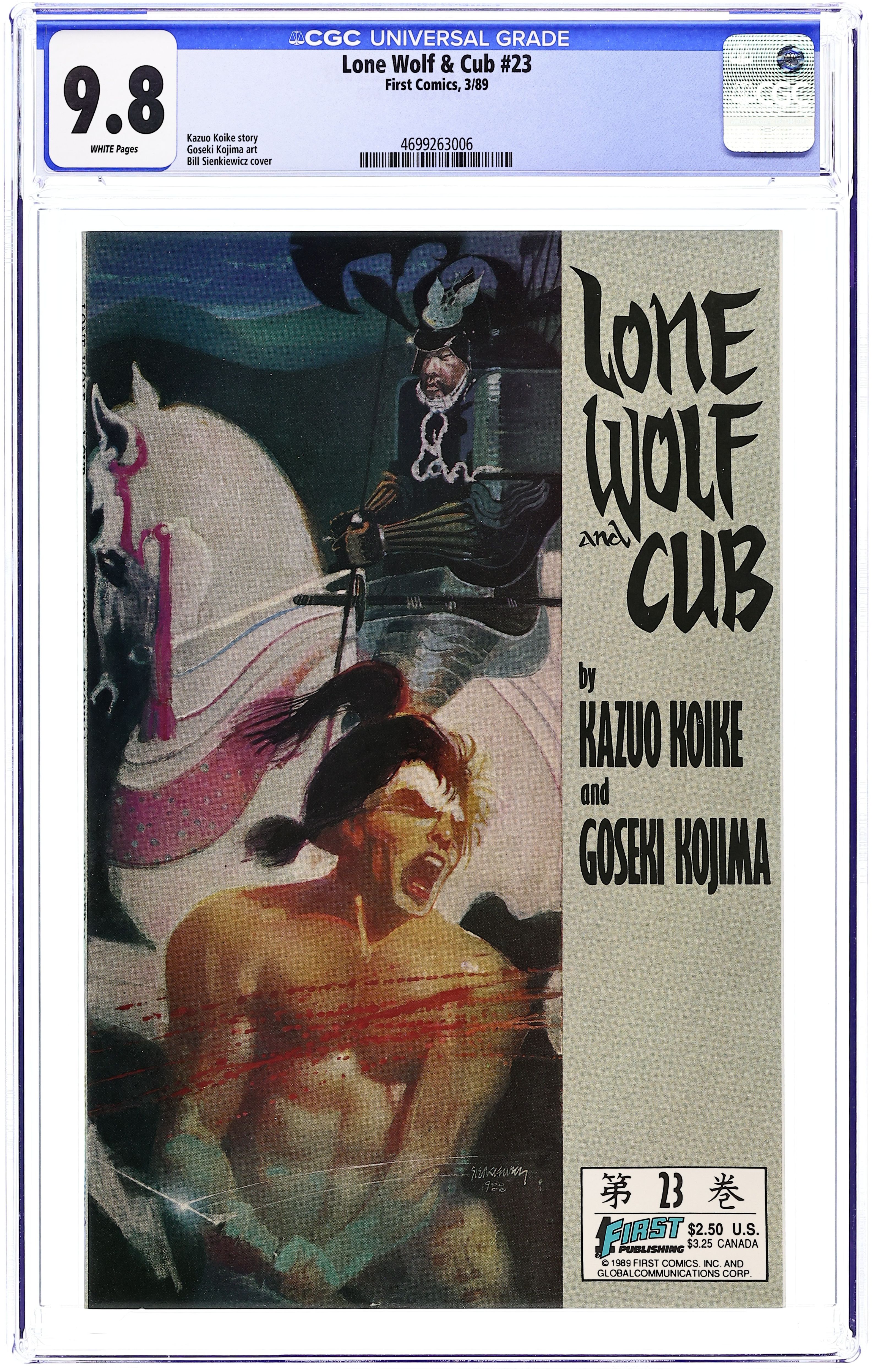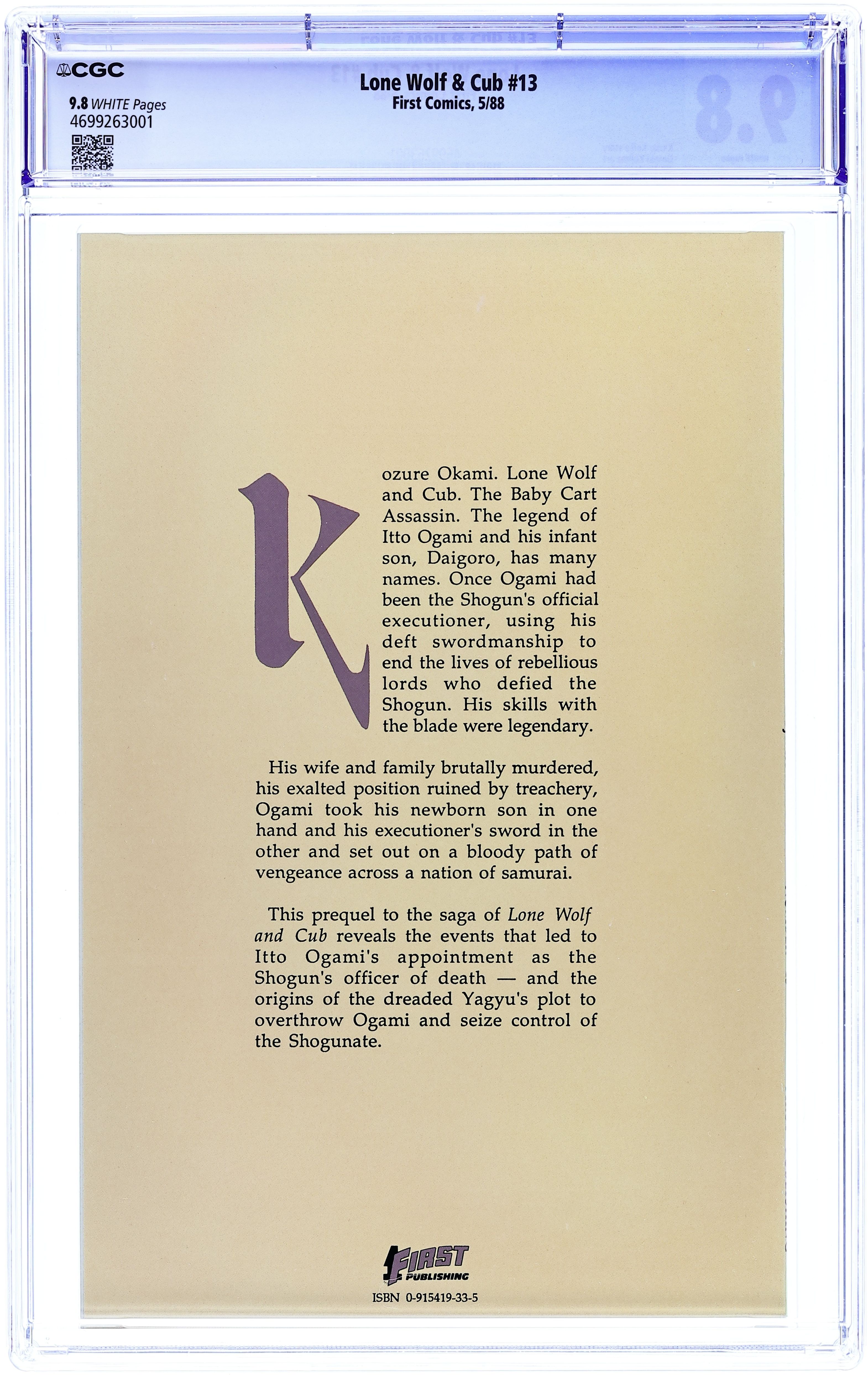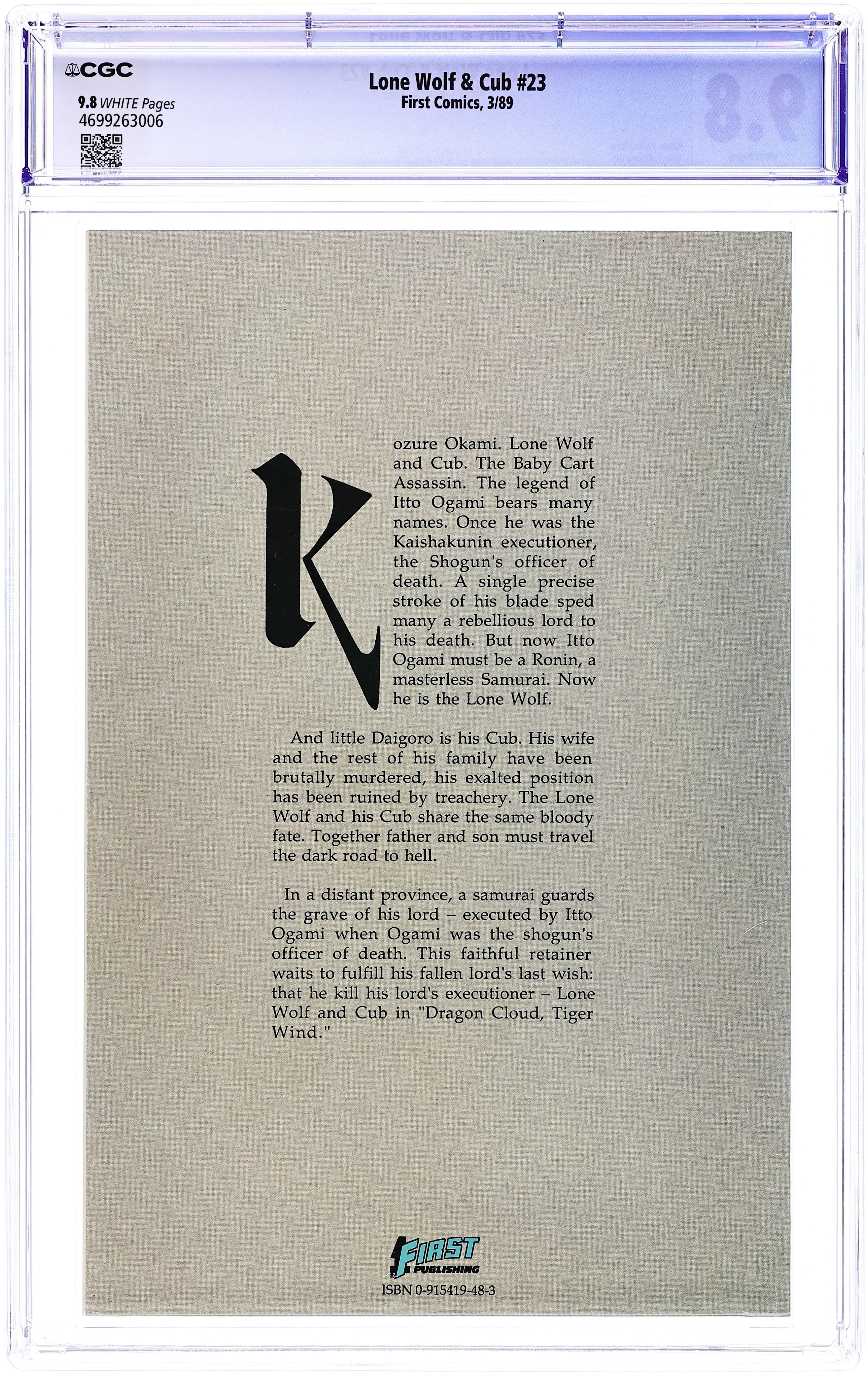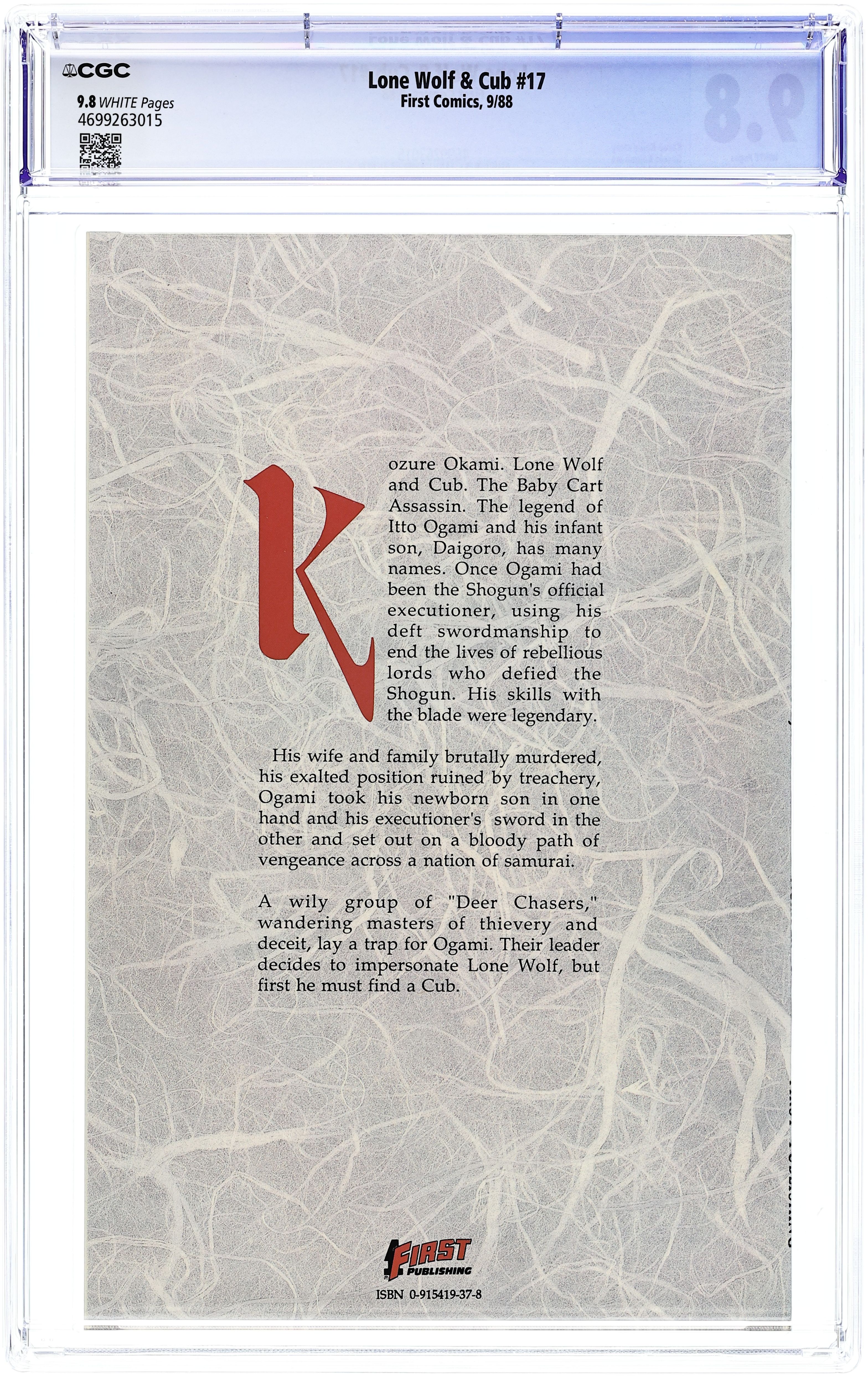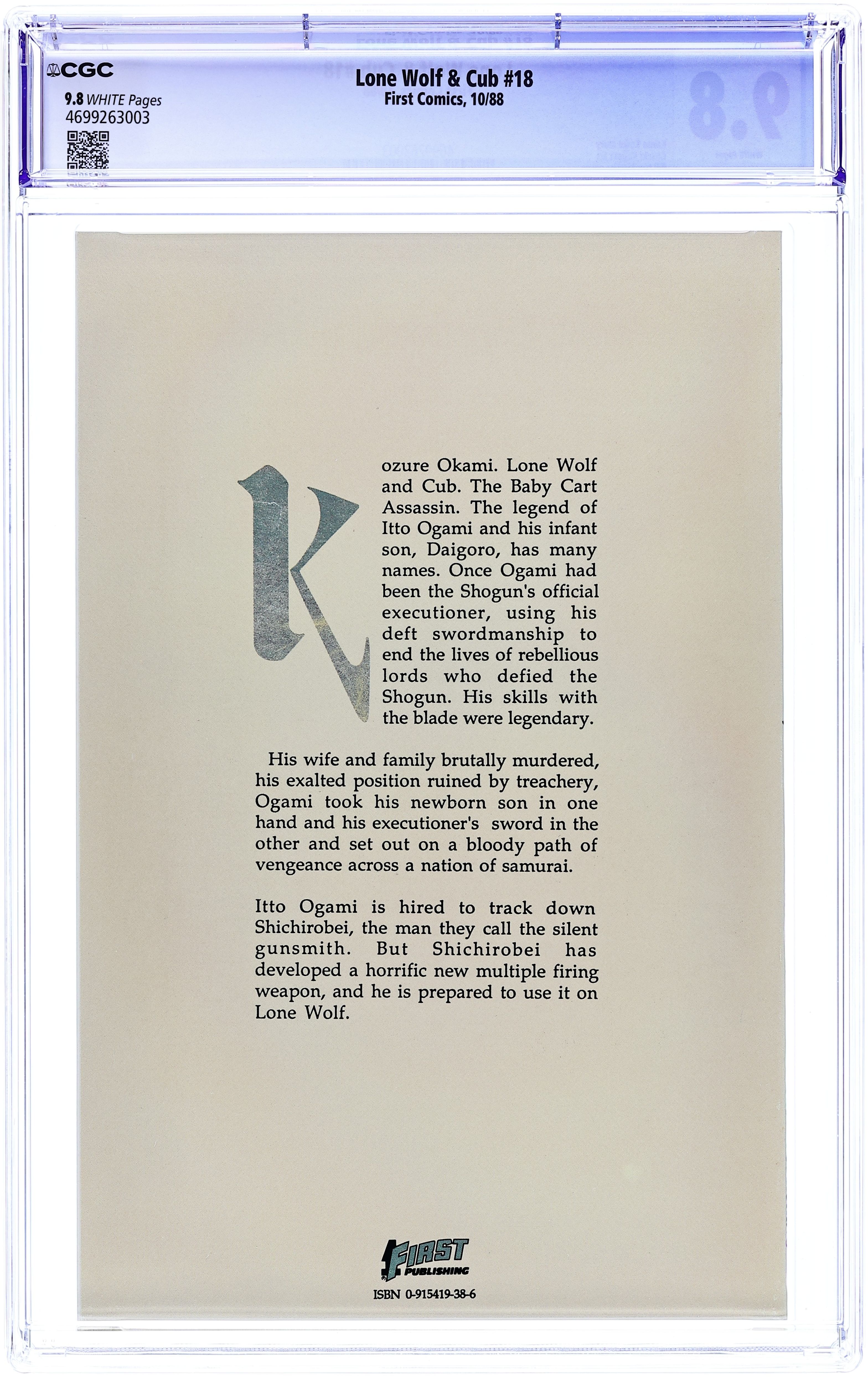 First printing. Frank Miller introduction and cover. Wrongfully accused of plotting to overthrow the Shogun, Itto Ogami becomes an outlaw, wandering through the provinces of feudal Japan, seeking vengeance for the murder of his wife and family. Awesome stories by Kazuo Koike and Goseki Kojma, presented in fantastic black and white art. Each issue in this series runs approximately 60 pages. Cover price $1.95.