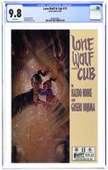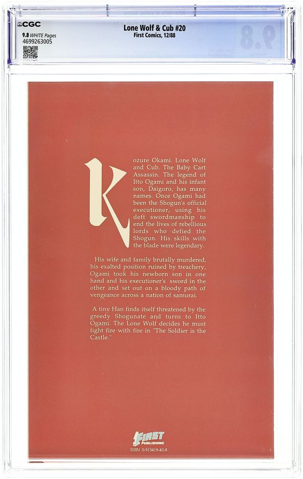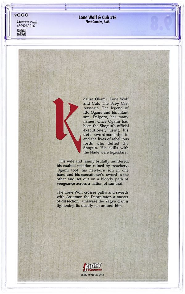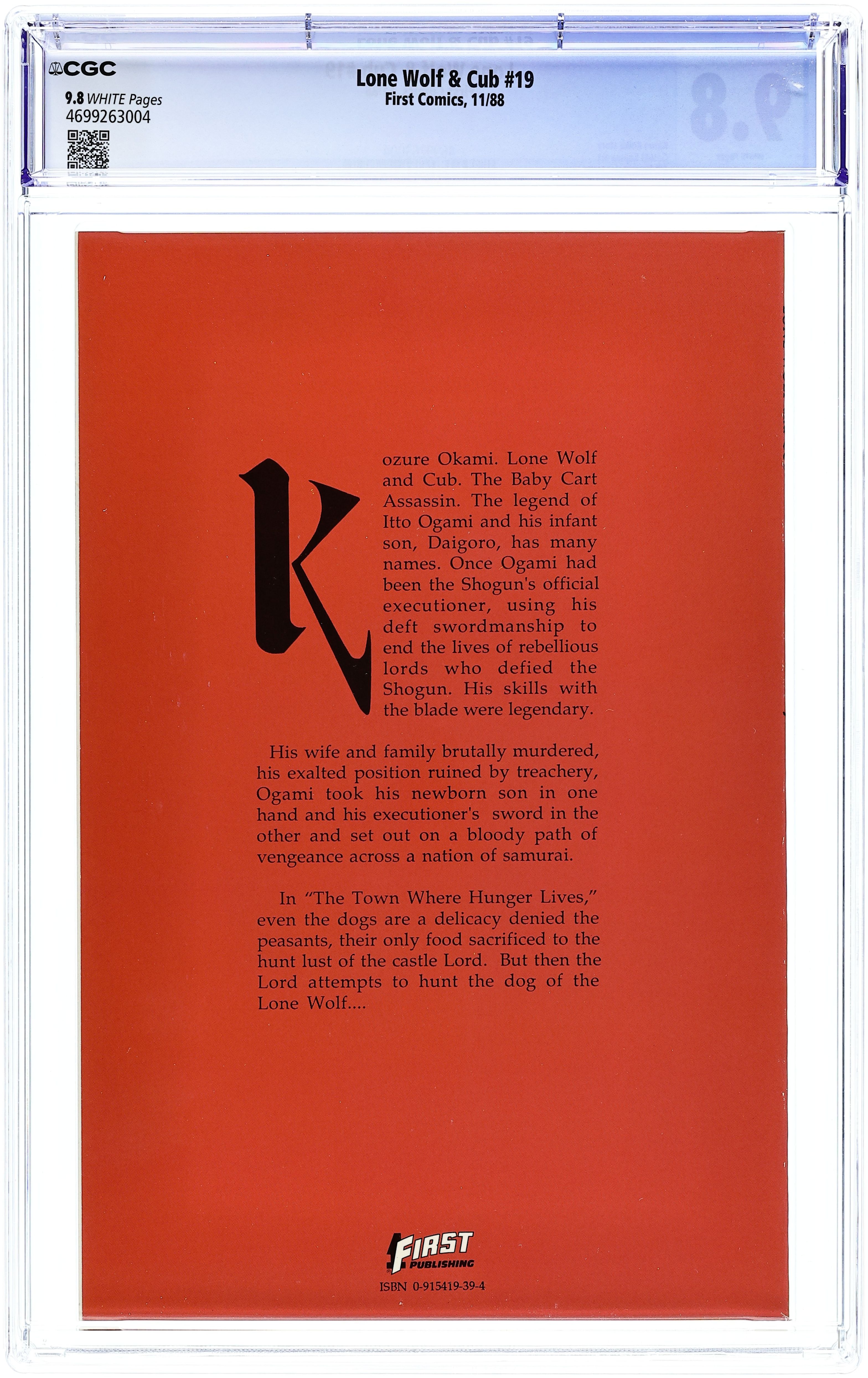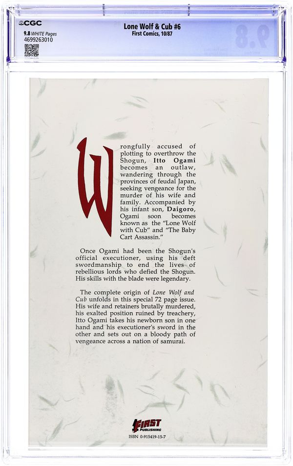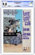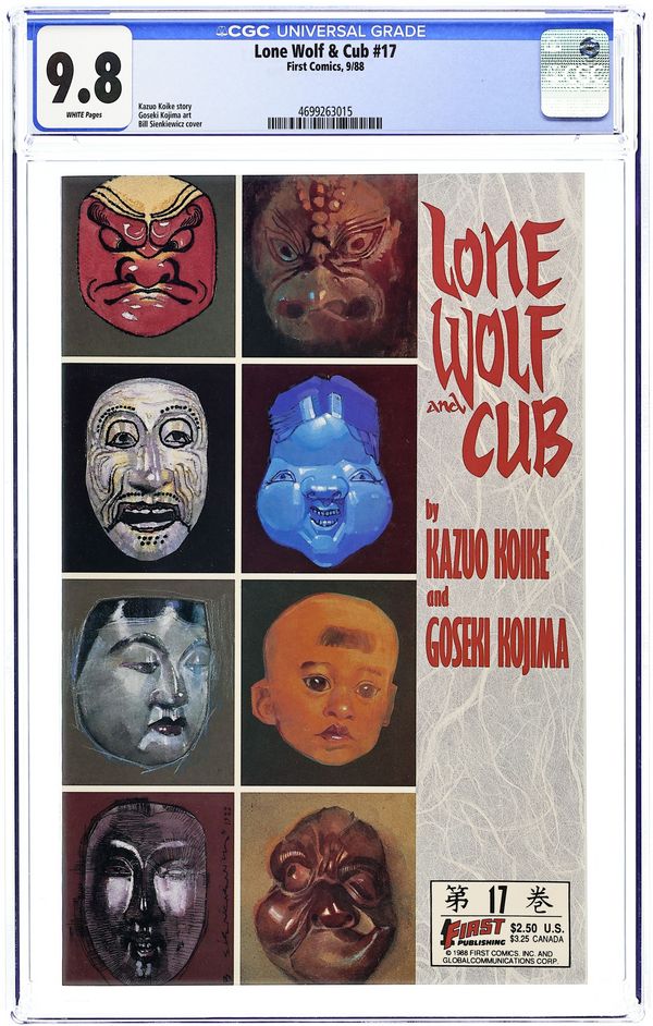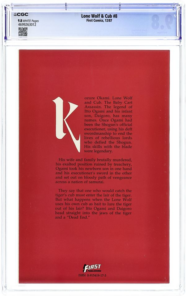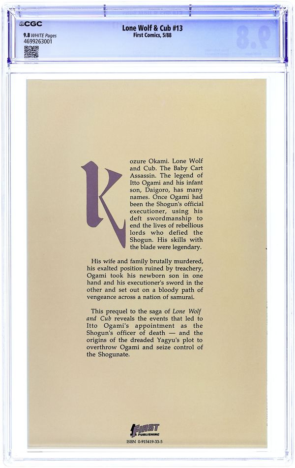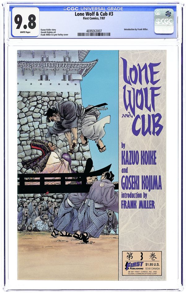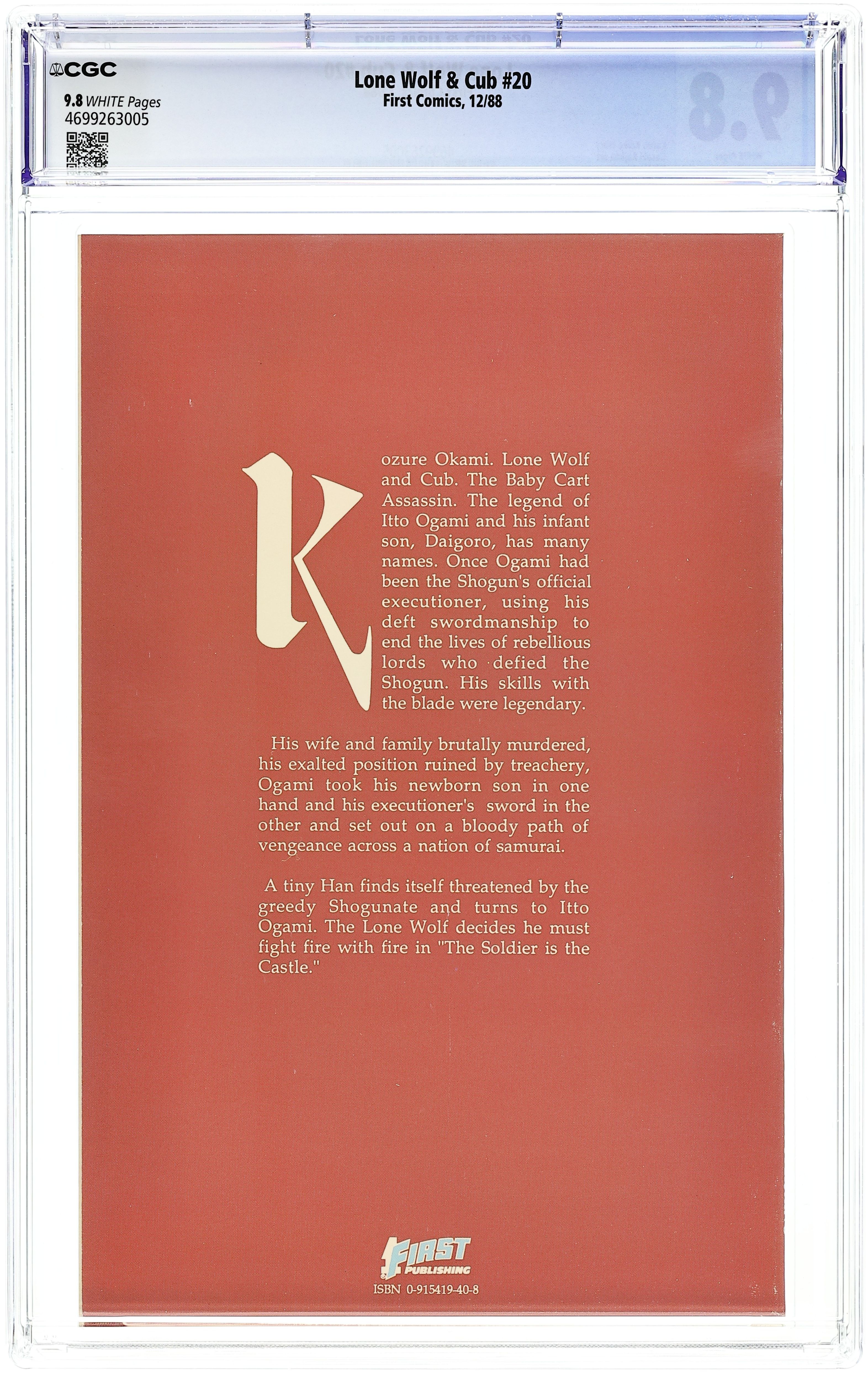 First printing. Frank Miller introduction and cover. Wrongfully accused of plotting to overthrow the Shogun, Itto Ogami becomes an outlaw, wandering through the provinces of feudal Japan, seeking vengeance for the murder of his wife and family. Awesome stories by Kazuo Koike and Goseki Kojma, presented in fantastic black and white art. Each issue in this series runs approximately 60 pages. Cover price $1.95.