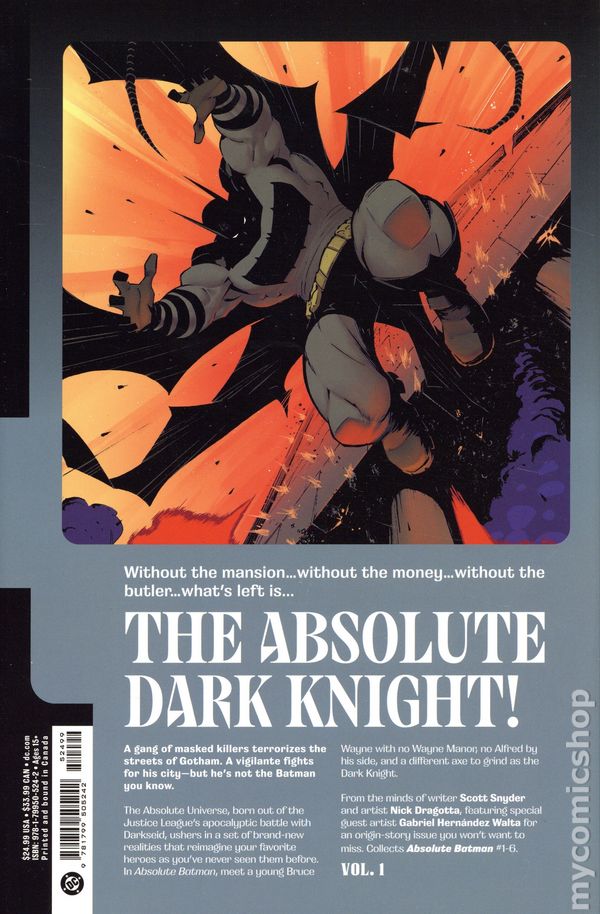 Volume 1 - 1st printing. "The Zoo!" Collects Absolute Batman (2024 DC) #1-6. Written by Scott Snyder. Art by Nick Dragotta and Gabriel Hernandez Walta. Cover by Nick Dragotta. A gang of masked killers terrorizes the streets of Gotham. A vigilante fights for his city--but he's not the Batman you know. The Absolute Universe, born out of the Justice League's apocalyptic battle with Darkseid, ushers in a set of brand-new realities that reimagine your favorite heroes as you've never seen them before. In Absolute Batman, meet a young Bruce Wayne with no Wayne Manor, no Alfred by his side, and a different axe to grind as the Dark Knight. From the minds of writer Scott Snyder and artist Nick Dragotta, and featuring special guest artist Gabriel Walta, comes an origin story you won't want to miss! Hardcover, 176 pages, full color. Teen+ Cover price $24.99.