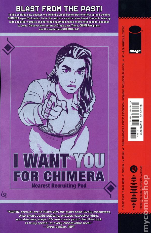Volume 3 - 1st printing. "Season Two: Part 1!" Collects Nights (2023 Image) #13-18. Written by Wyatt Kennedy. Art and Cover by Luigi Formisano. Season Two begins with a blast from the past in this extended prequel arc! Following the events of last season's violent finale, we turn the clock back to the 1970s where rookie CHIMERA agent Tsukumari investigates the rise of dangerous magical oddities and artifacts from the blistering cold of Estonia to the boiling decadence of Las Vegas. This journey will lead him on a collision course with a familiar vampire girl and her witch boyfriend that will have ripple effects across decades. Before we move forward, we have to go back. A dark path lies ahead... Softcover, 166 pages, full color. Mature Readers Cover price $16.99.