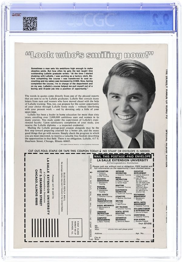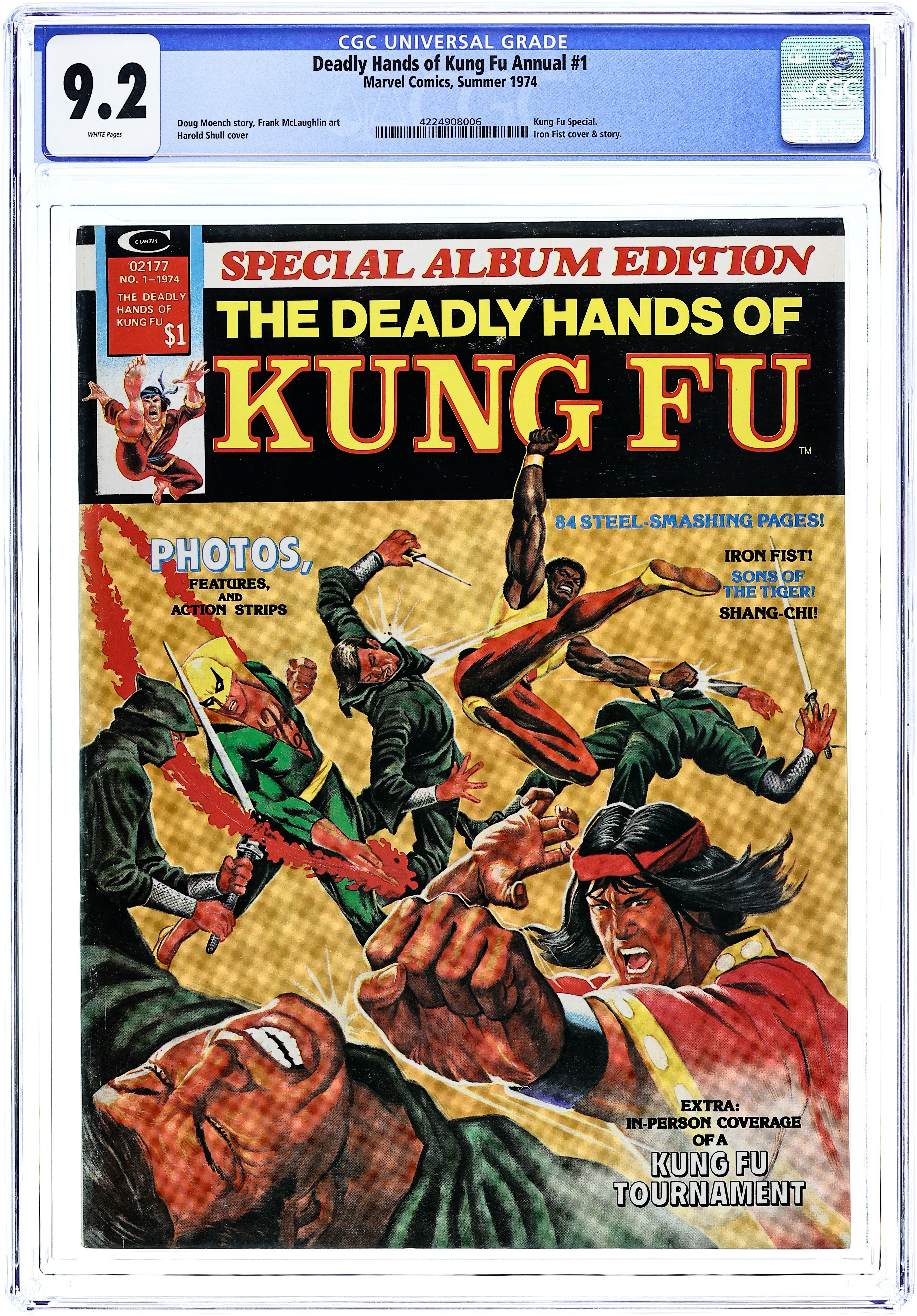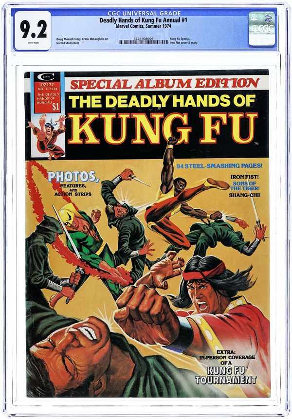 Stan Lee Presents: The Deadly Hands of Kung Fu Special Album Edition. Cover by Harold Shull. Includes: "The Rising and advancing of a Spirit!" An editorial by Tony Isabella. Shang Chi, the Master of Kung Fu, Iron Fist, and the Sons of the Tiger star in "The Master Plan of Fu Manchu!" Prologue. Story by Tony Isabella. Art by John Buscema. Chapter 1: Iron Fist. Story by Doug Moench. Art by Frank McLaughlin. "Kaii-Yaahhh!" An exclusive look at Fred Hamilton's All-Dojo Tournament by John Warner and Mary Skrenes. "Fu Manchu, Sax Rohmer, and Shang Chi!" An article by David Kraft. Chapter 2: Sons of the Tiger! Story by Chris Claremont. Art by Herb Trimpe. "The Chinese Machine!" A movie review of the film starring Barry Chan by John Warner. "Shaolin Flashback!" An exclusive look at the Shaolin Monks by Malachi Ronin. Chapter 3: Shang Chi, the Master of Kung Fu. Story by Doug Moench. Art by Mike Vosburg and Dan Adkins. Epilogue. Story by Tony Isabella. Art by John Buscema. 82 pages, black and white. Cover price $1.00.