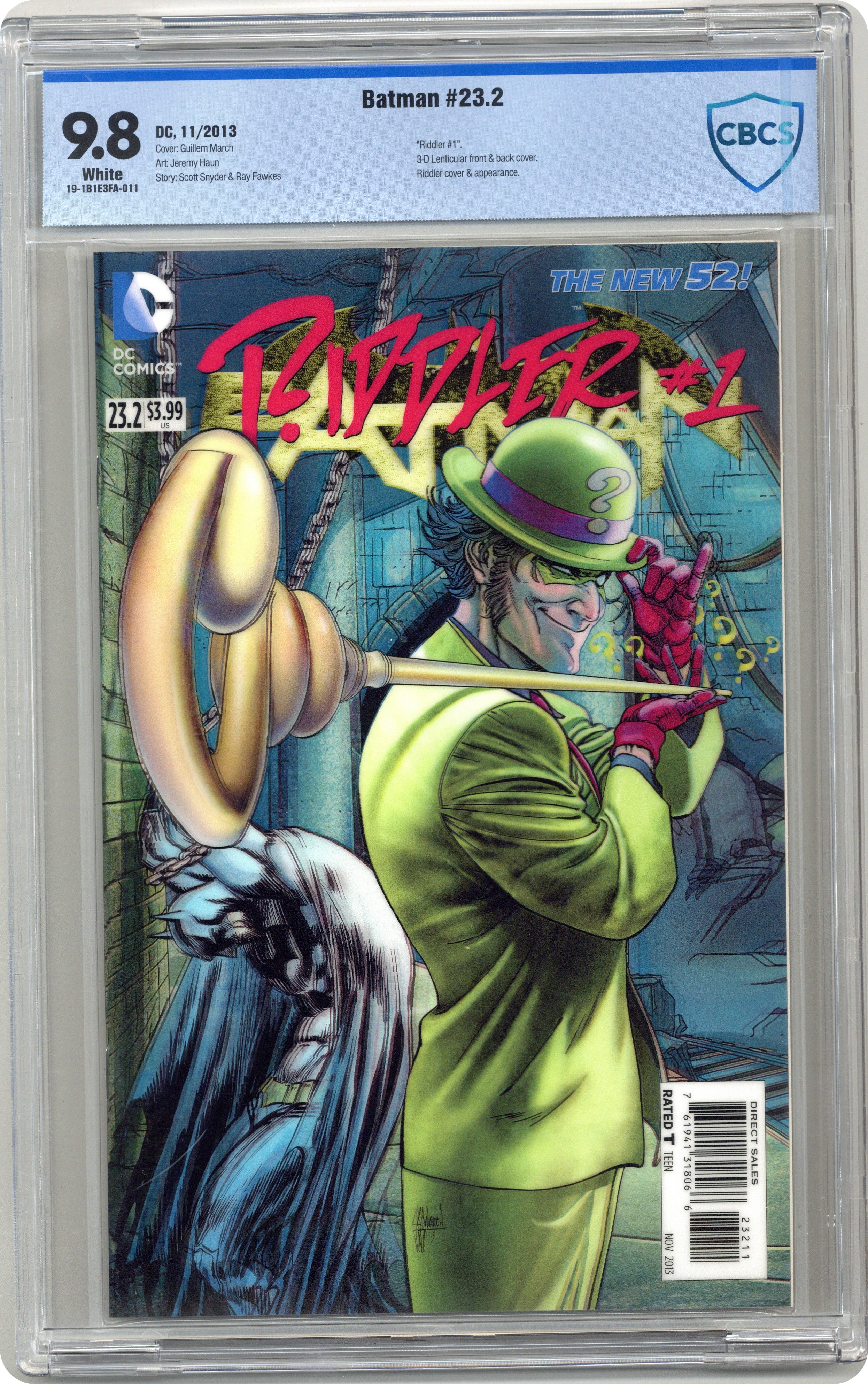3D COVER (W) Scott Snyder, Ray Fawkes (A) Jeremy Haun (CA) Guillem March With The Dark Knight out of the picture, The Riddler engages in an epic game of wits. Learn what maddening early moments led a young Edward Nygma to evolve into Gotham City's Prince of Mischief! And see how events of ZERO YEAR continue to affect The Riddler today! Cover price $2.99.