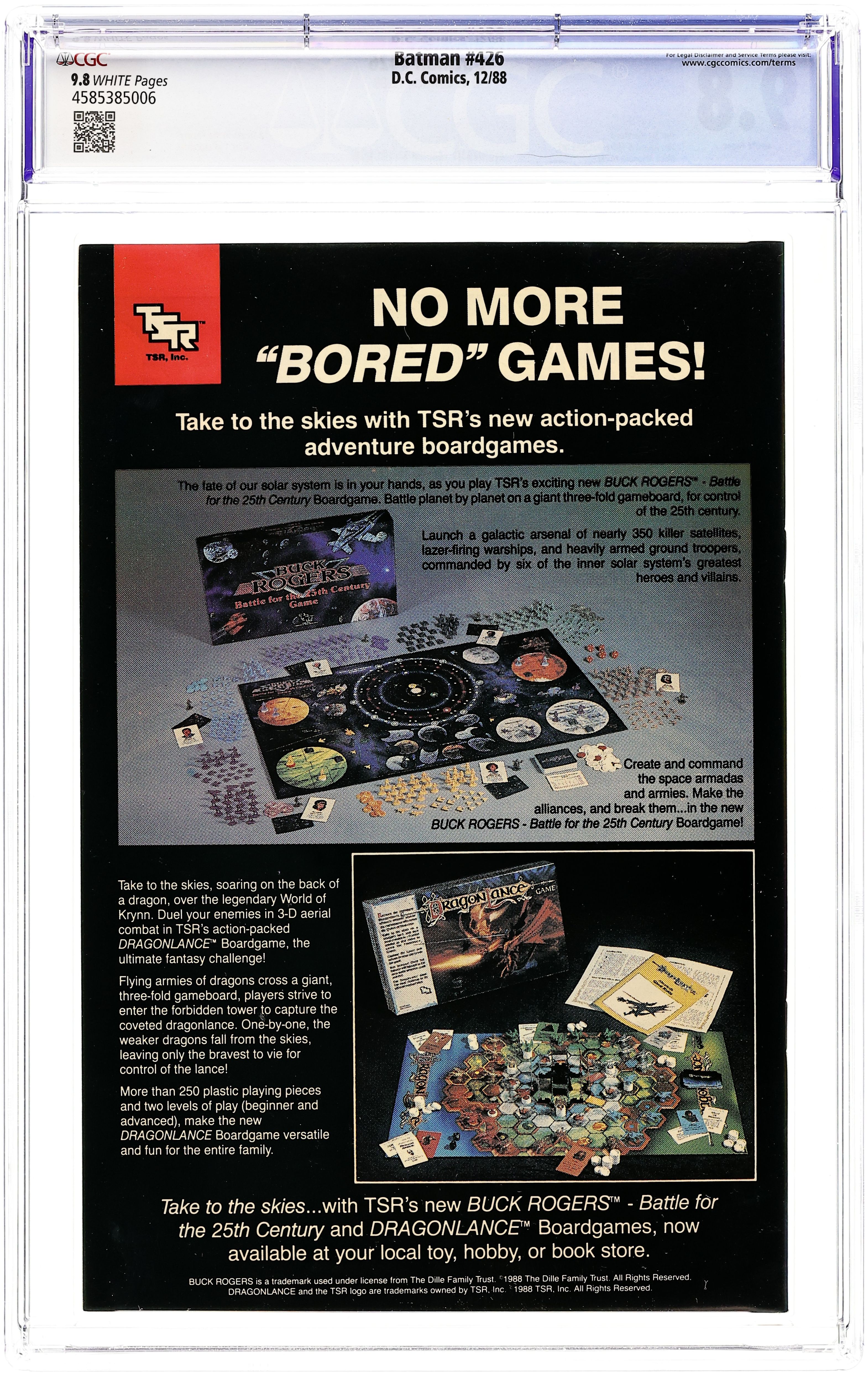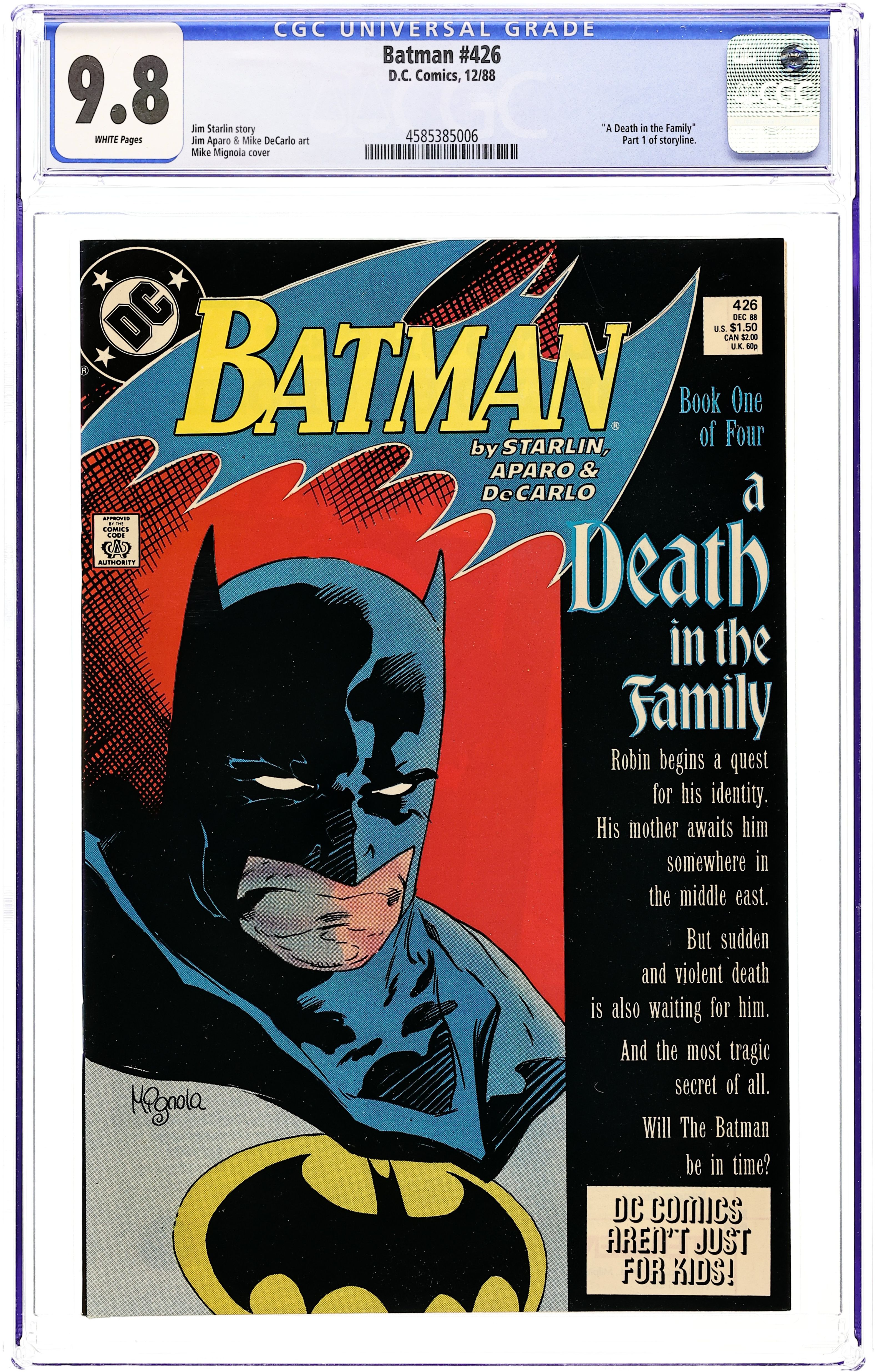 First printing. Direct Edition. Cover art by Mike Mignola. "A Death in the Family" part 1 of 4, script by Jim Starlin, pencils by Jim Aparo, inks by Mike DeCarlo; Jason discovers that his "real" mother was really his step-mother, and his birth mother is still alive; Joker escapes from Arkham and Batman chases him to the Middle East where he runs across Jason looking for one of the women he thinks is his mom. Infamous story where readers called an 800 number, and 'voted' to have Robin killed! Story continues in Batman #427. NOTE: Most issues from 397-432 were reprinted in 1989 and sold in multipacks. These 2nd and 3rd prints have back cover ads dated 1989. 52 Pages, Full Color. Cover price $1.50.