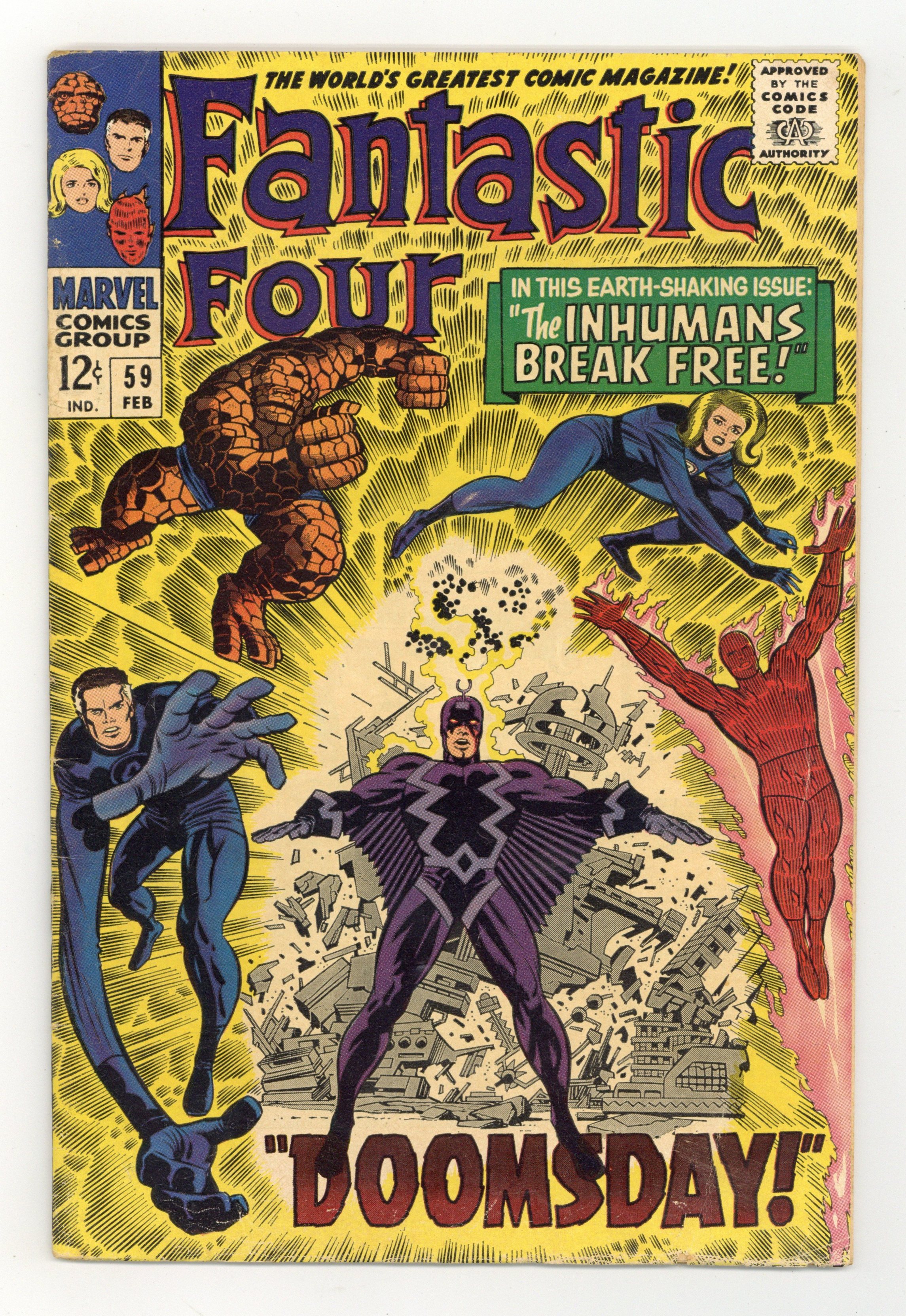 Starts Apr 27 Cover pencils by Jack Kirby, inks by Joe Sinnott. Doctor Doom steals the Silver Surfer's cosmic powers (part 3 of 4) in Doomsday, script by Stan Lee and Jack Kirby (co-plot), pencils by Jack Kirby, inks by Joe Sinnott; Dr. Doom wreaks havoc across the globe with the Power Cosmic; Black Bolt destroys the barrier that was imprisoning the Inhumans. Brief Inhumans appearance. 36 pgs. $0.12. Cover price $0.12.