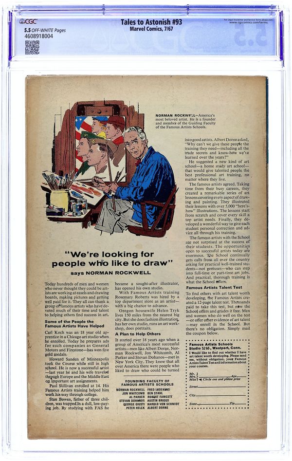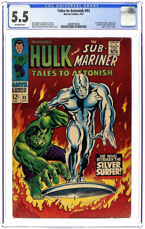 Cover by Marie Severin and Frank Giacoia. The Monarch and the Monster, script by Roy Thomas and Dan Adkins; As Namor battles It, torpedoes from the submarine cause an avalanche, trapping It; Namor turns on the submarine and begins to punch holes in it; It (the creature) returns and they battle, further damaging the submarine and (apparently) killing it;The submarine leaves (with the carcass of It) while Namor breaks off, feeling weakness overwhelm him. He Who Strikes the Silver Surfer, script by Stan Lee, art by Marie Severin; Having 'caught' the Silver Surfer (believing him to be an alien starship), Hulk starts a fight with perhaps the only being on Earth stronger than Hulk is; The Surfer, irritated, knocks him out, then probes Hulk to discover the reason for his belligerence and discovers the damage done by the gamma radiation; Just as the Surfer prepares to reverse the damage and return Dr. Banner's life, Hulk wakes up and, seeing the action as an attack, lashes out. 36 pages, full color. Cover price $0.12.
