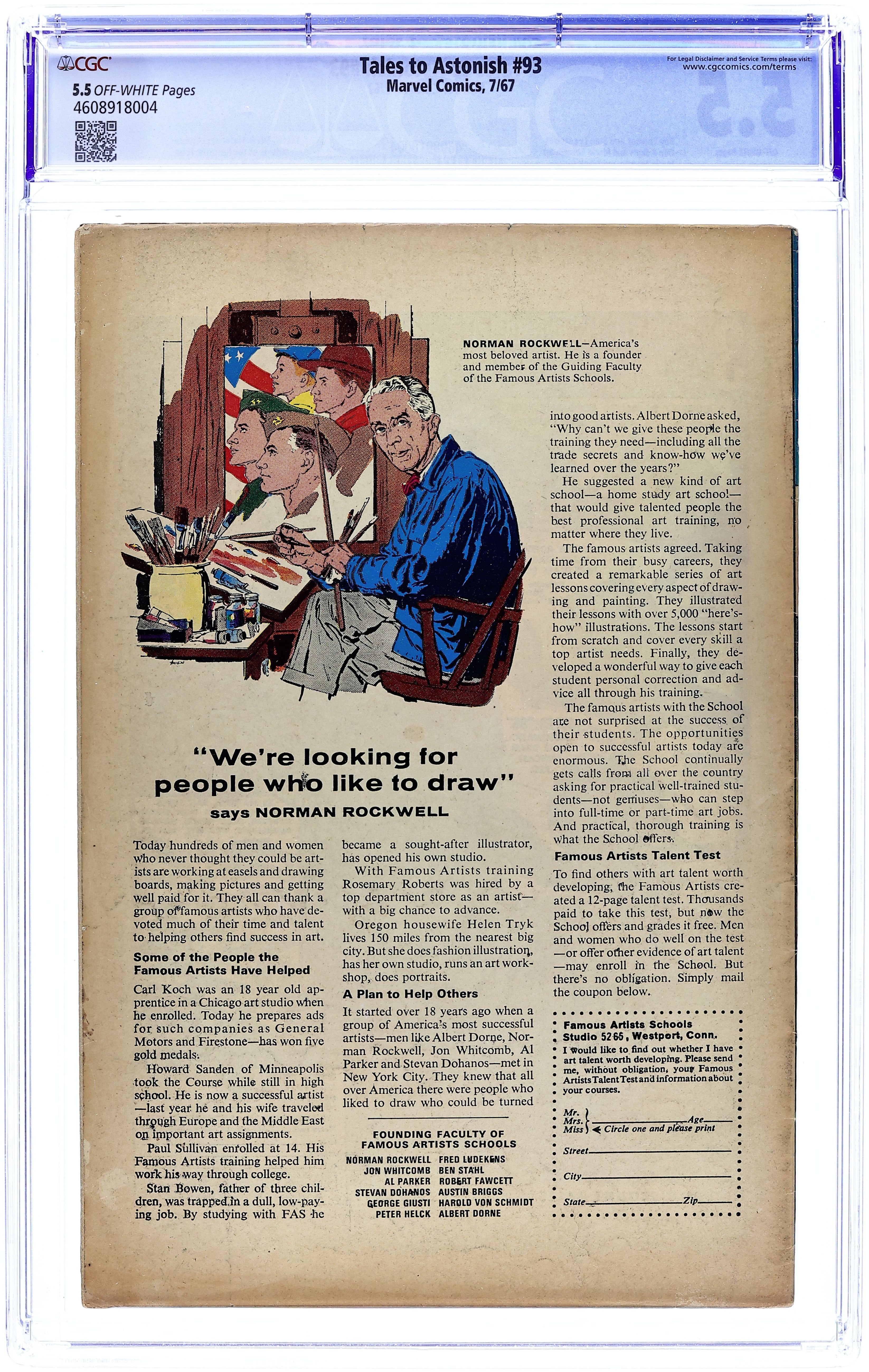 Cover by Don Heck and Dan Adkins. :It Walks Like a Man!, script by Stan Lee, art by Dan Adkins; When a passing ship dumps a radioactive barrel into Namor's realm, he realizes the danger it poses and takes it far away from Atlantis to throw it into a deep crevasse; Little does he know that the radiation in the barrel has awakened an ancient monster who begins to menace both the surface world and the world beneath the waves alike. Turning Point!, script by Stan Lee, art by Marie Severin and Frank Giacoia; Betty bemoans her loss of Bruce; Bruce, in disguise, bemoans his circumstances, then transforms into Hulk who flees his hotel room in typical Hulk fashion - through the wall; Outside, Hulk sees a 'flying saucer' and leaps to bring it down so the aliens can take him far from Earth; What he brings down is not a saucer but the mighty Silver Surfer! 36 pgs., full color. $0.12. Cover price $0.12.