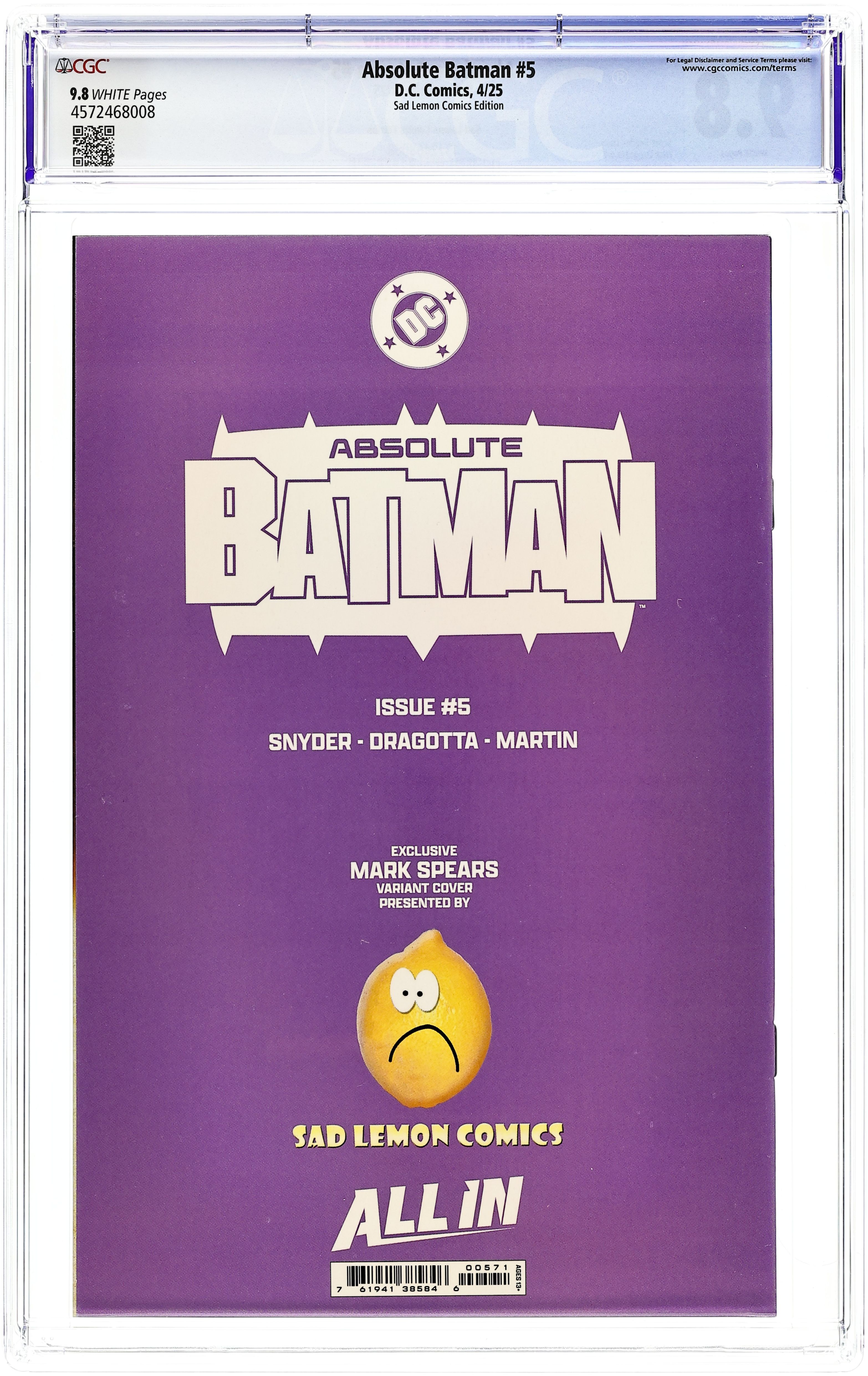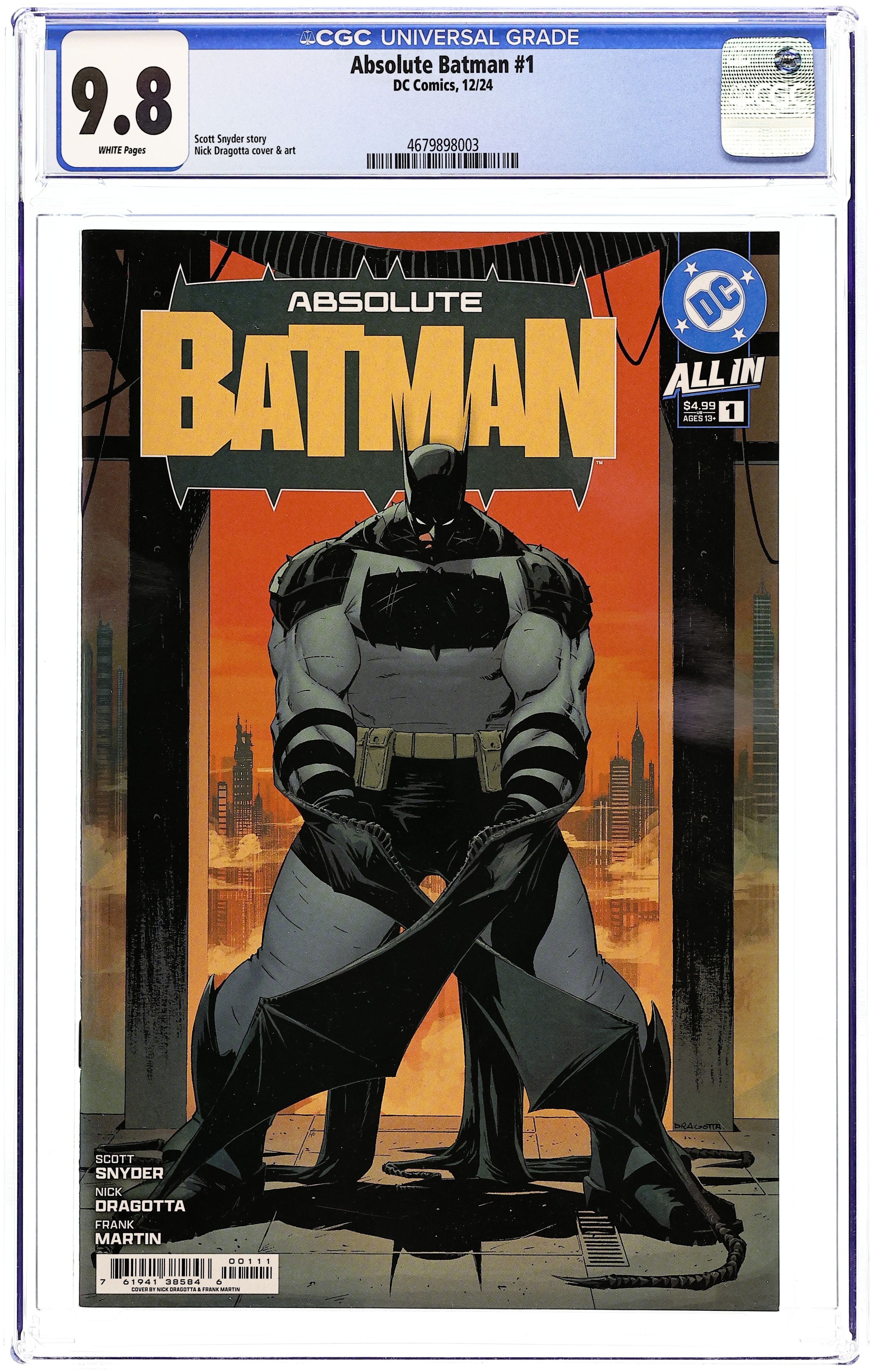 Limited 1 for 50 Retailer Incentive Variant Cover. Written by Scott Snyder. Art by Nick Dragotta. Cover by Mitch Gerads. BATMAN LEGEND SCOTT SNYDER AND ICONIC ARTIST NICK DRAGOTTA TRANSFORM THE DARK KNIGHT'S TALE FOR THE MODERN AGE! Without the mansion...without the money...without the butler...what's left is the Absolute Dark Knight! 48 pages, full color. Rated T+ Cover price $5.99.