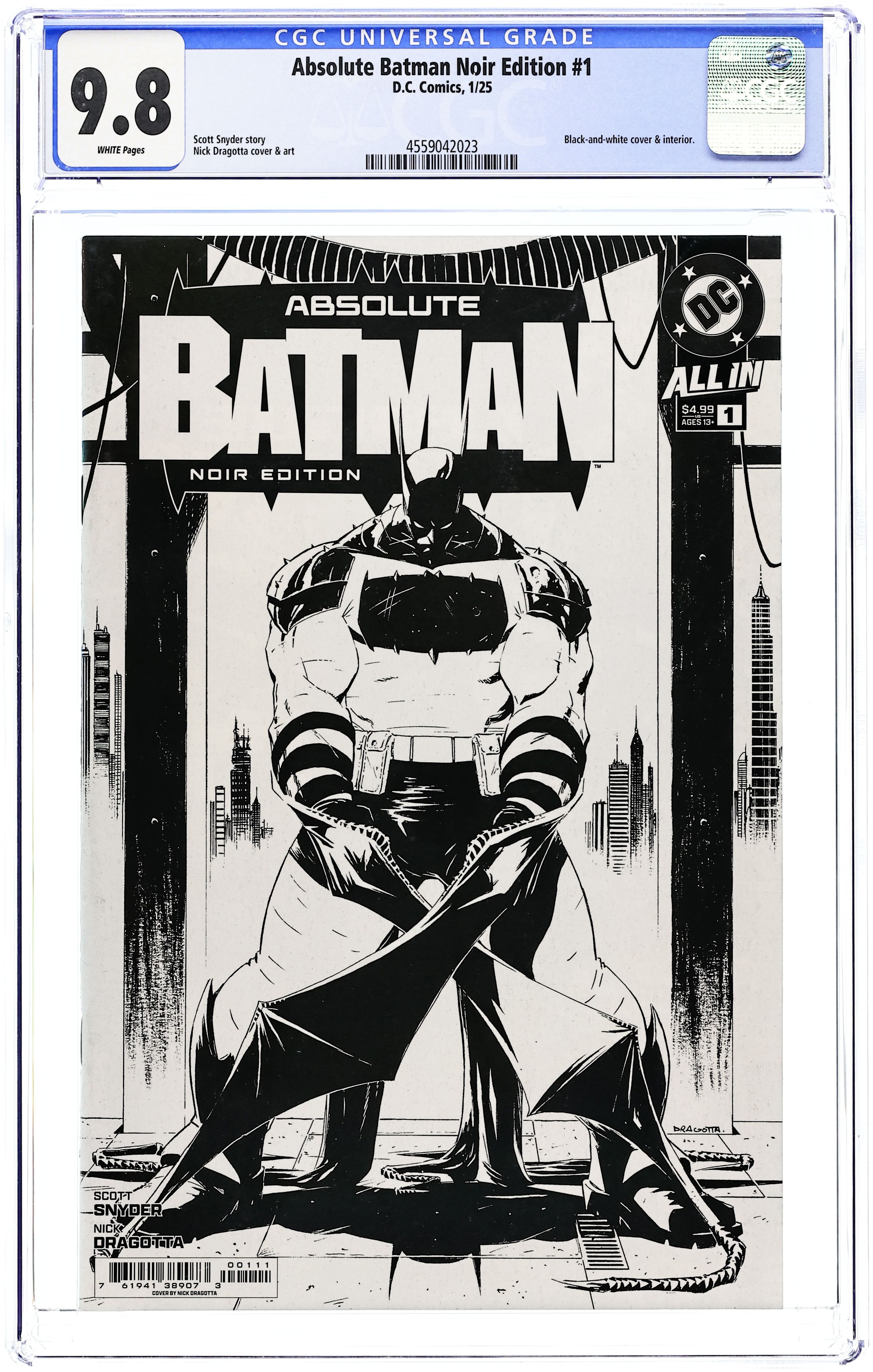 Written by Scott Snyder. Art and Cover by Nick Dragotta. BATMAN LEGEND SCOTT SNYDER AND ICONIC ARTIST NICK DRAGOTTA TRANSFORM THE DARK KNIGHT'S TALE FOR THE MODERN AGE! Without the mansion...without the money...without the butler...what's left is the Absolute Dark Knight! 44 pages, full B&W. Rated T+ Cover price $4.99.