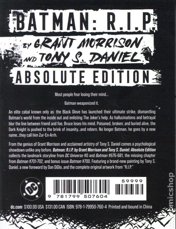 1st printing. Collects DC Universe Zero (2008), Batman (1940-2011) #676-683, and 700-702. Written by Grant Morrison. Art by Tony Daniel and Sandu Florea. Cover by Alex Ross. THE MASTERWORK BY GRANT MORRISON AND TONY S. DANIEL IS FINALLY BROUGHT TO THE ABSOLUTE FORMAT! Most people fear losing their mind... Batman weaponized it. From the genius of Grant Morrison and acclaimed artistry of Tony S. Daniel comes a psychological showdown unlike any before. BATMAN: R.I.P.: ABSOLUTE EDITION collects the landmark storyline from DC UNIVERSE #0 and BATMAN #676-681, the missing chapter from BATMAN #701-702, and bonus issue BATMAN #700. Featuring a brand new introduction and painting by Tony S. Daniel, along with the complete original art from R.I.P. Hardcover (with Slipcase), 8-in. x 10 1/2-in., 432 pages, full color. Cover price $100.00.