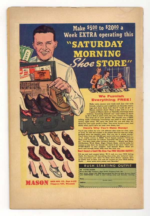 Starts Jan 3 Cover by Jack Kirby and Dick Ayers. Return of the Ant-Man, Part 1, script by Stan Lee and Larry Lieber, art by Jack Kirby and Dick Ayers; Henry Pym invents an anti-radiation gas, that attracts the attention of communist spies. Strange Encounter, art by Joe Maneely; An American tourist in Paris is unwittingly targeted by a spy as an intelligence courier and is nearly killed. Return of the Ant-Man Part 2: An Army of Ants, script by Stan Lee and Larry Lieber, art by Jack Kirby and Dick Ayers; Henry Pym learns how to command ants to do his bidding and frees his captured assistants, with the help of the ants. Return of the Ant-Man Part 3: The Ant-Man's Revenge!, script by Stan Lee and Larry Lieber, art by Jack Kirby and Dick Ayers; Henry Pym invents an anti-radiation gas, that attracts the attention of communist spies. The Doorway to Nowhere!, script by Stan Lee, art by Steve Ditko; After escaping from jail, Hugo Cragg heads for a deserted mansion to hide out until the heat is off. The Thing from Outer Space!, art by Don Heck. 36 pgs., full color. $0.12. Cover price $0.12.