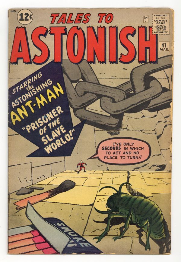 Starts Feb 2 Cover by Jack Kirby and Dick Ayers. Prisoner of the Slave World!, script by Stan Lee and Larry Lieber, art by Don Heck; Henry Pym is kidnapped along with other scientists in order to build a super-weapon for a tyrant in another dimension. Tricky Travel text story. When the Beast Walks!, script by Stan Lee and Larry Lieber, art by Joe Sinnott; An animal-loving reporter saves a four-armed ape from a hunter and discovers that it is really an alien looking for a human worthy of hearing its message. The Curse!, script by Stan Lee, art by Steve Ditko; A dictator pretends that a treasure is cursed in order to get it for himself, but it turns out the treasure is cursed and a ghost takes him. 36 pgs., full color. $0.12. Cover price $0.12.