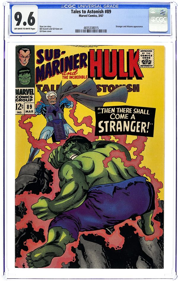 Ends Dec 15 9:44 PM CST Bid History 9 bids Current Bid $43 Your Secret Max Bid If you'd like to bid, please log in or register. Cover by Gil Kane. The Prince and the Power!, script by Stan Lee, art by Bill Everett; Attuma has sent a giant alien robot to destroy Atlantis and it takes all of the power of Namor, his subjects and his underwater animal friends to hold the creature at bay; The battle abruptly ends when the aliens show up to retrieve their missing mechanical servant. Then, There Shall Come a Stranger!, script by Stan Lee, art by Gil Kane; The Stranger arrives on Earth and programs the Hulk to be his agent to wipe out humanity. 36 pgs., full color. $0.12. Cover price $0.12.