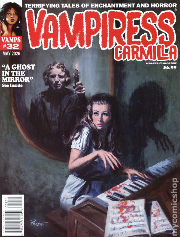 (W) Various (A) Various (CA) Vic Prezio Vampiress Carmilla #32 revives the iconic Warren illustrated horror magazines by replicating Warrens early page layouts and publishing new, classic styled work by original Warren artists, writers and editors. Each issue is a highly collectible instant classic! 50 pages, not rated, B&W Cover price $6.99.