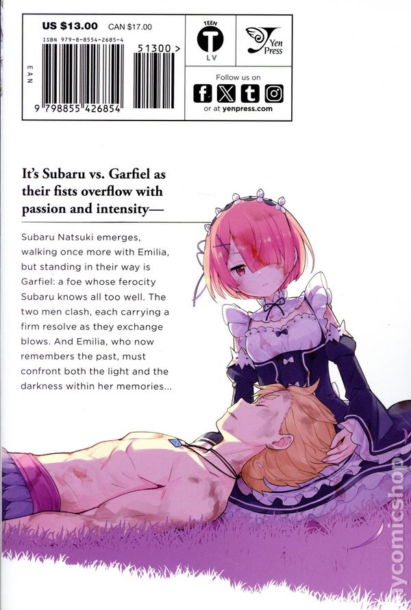 Volume 10 - 1st printing. Based on the Story by Taooei Nagatsuki. Adapted by Yu Aikawa. Art by Haruno Atori. Cover by Enoki Tomoyuki. Translated by Jeremiah Bourque. Its Subaru vs. Garfiel as their fists overflow with passion and intensity — Subaru Natsuki emerges, walking once more with Emilia, but standing in their way is Garfiel: a foe whose ferocity Subaru knows all too well. The two men clash, each carrying a firm resolve as they exchange blows. And Emilia, who now remembers the past, must confront both the light and the darkness within her memories... Softcover, 5-in. x 7-in., 212 pages, B&W. Age 13+ Cover price $13.00.