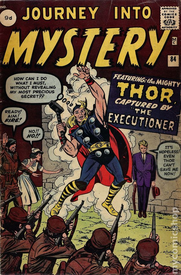 UK edition. Identical to US edition, but has 9d cover price. First appearance Loki and Heimdall, plus cameos of Odin, Balder, and Tyr, in "Trapped By Loki, the God of Mischief!" Plot by Stan Lee, script by Larry Lieber, pencils by Jack Kirby, inks by Dick Ayers. Jane Foster (Nelson) guest appearance. First appearance of Asgard. Back-up stories: "Filbert's Frightful Future" with script by Lee, art by Don Heck; "Off LImits" with script by Lee, art by Steve Ditko; and a two-page text story, "The Clock." Kirby/Ayers cover.