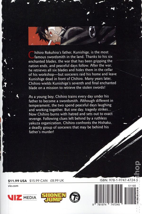 Volume 1 - 1st printing. Story and art by Takeru Hokazono. Translated by Camellia Nieh. As a young boy, Chihiro trains every day under his father to become a swordsmith. Although different in temperament, the two spend peaceful days laughing and working together. But one day, tragedy strikes... Now Chihiro burns with hatred and sets out to exact revenge. Following clues left behind by a ruthless yakuza organization, Chihiro confronts the Hishaku, a deadly group of sorcerers that may be behind his father's murder! Softcover, 5-in. x 7-in., 216 pages, B&W. Older Teen Cover price $11.99.