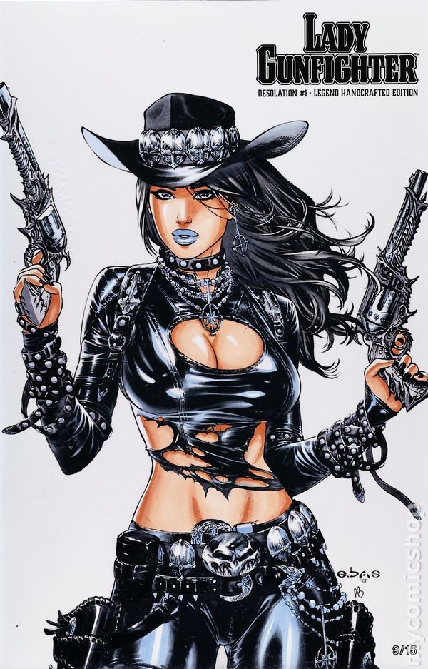 Legend Handcrafted Edition Variant Cover by Eric Basaldua - limited to 15 signed and hand-colored copies. Signed and colored by Anya Beam. Story by Brian Pulido and Mike MacLean. Art by Joel Gomez. 48 pages of story and art! Set in 1876, post Civil War America. As a teenager, Eliza Ryan was Lady Gunfighter, star attraction of Winchester Willie's Traveling Wild West Show. But Eliza gave up her sharpshooting ways to become a loving wife and mother. Then came that fateful night of bloodshed and fire. Ten years later, Eliza dons the Lady Gunfighter moniker once again and journeys across the ultraviolent hellscape that is the old west. A demonic revolver rides in her gun belt, a weapon of dark power that whispers to Lady Gunfighter in an ancient, malevolent language. Will cursed bullets and sharpshooting skills be enough to stop the man responsible for destroying Eliza's family- the infamous killer Jebediah Kane? NOTE: Generic image is of a signed and hand-colored copy, this does not necessarily reflect all copies.