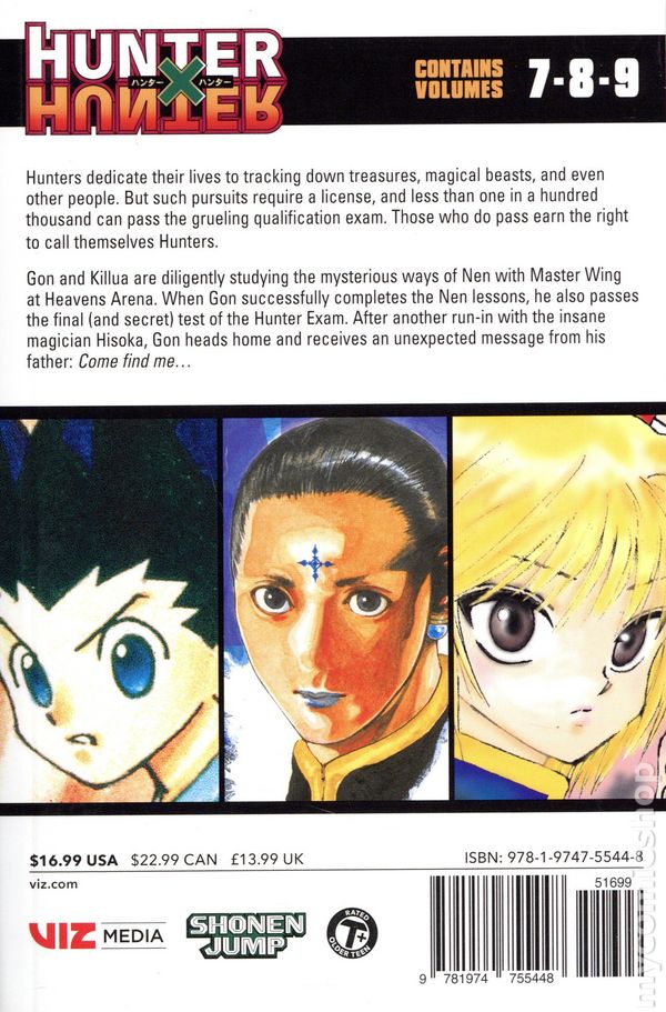 Volume 7-9 - 1st printing. Story and art by Yoshihiro Togashi. Adapted by Gary Leach. Translated by Lillian Olsen. Plucky Gon's quest to find his dad leads him into a whole world of crazy adventure. Hunters dedicate their lives to tracking down treasures, magical beasts, and even other people. But such pursuits require a license, and less than one in a hundred thousand can pass the grueling qualification exam. Those who do pass earn the right to call themselves Hunters. Gon and Killua are diligently studying the mysterious ways of Nen with Master Wing at Heavens Arena. When Gon successfully completes the Nen lesson, he also passes the final (and secret) test of the Hunter Exam. After another run-in with the insane magician Hisoka, Gon heads home and receives an unexpected message from his father: Come find me... Softcover, 5-in. x 7 1/2-in., 576 pages, B&W. Older Teen Cover price $16.99.