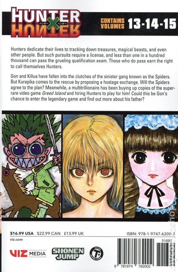 Volume 13-15 - 1st printing. Story and art by Yoshihiro Togashi. Adapted by Gary Leach. Translated by Lillian Olsen. Togashi Plucky Gons quest to find his dad leads him into a whole world of crazy adventure. Hunters dedicate their lives to tracking down treasures, magical beasts, and even other people. But such pursuits require a license, and less than one in a hundred thousand can pass the grueling qualification exam. Those who do pass earn the right to call themselves Hunters. Gon and Killua have fallen into the clutches of the sinister gang known as the Spiders. But Kurapika comes to the rescue by proposing a hostage exchange. Will the Spiders agree to the plan? Meanwhile, a multitrillionaire has been buying up copies of the super-rare video game Greed Island and hiring Hunters to play the game for him! Could this be Gons chance to enter the legendary game and find out more about his father? Softcover, 5-in. x 7 1/2-in., 600 pages, B&W. Older Teen Cover price $16.99.