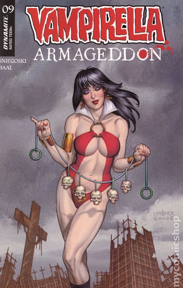 Limited 1 for 10 Retailer Incentive Variant Cover. (W) Tom Sniegoski (A) Edu Menna (CA) Joseph Michael Linsner DARK VAMPI RISING! In this issue: All Hell breaks loose — literally! Rising up from the deepest circles of the Inferno, Dark Vampirella has been loosed upon the world, and shes bringing fiery vengeance with her! Can the heroic Daughter of Drakulon stand up to her bigger, badder self and survive to drink blood another day? Find out in the brimstone-scented pages of Vampirella: Armageddon #9, from the diabolically creative team of TOM SNIEGOSKI and EDU MENNA — featuring sinfully sensuous covers from FRANCESCO MATTINA, LESLEY LEIRIX LI, JOSEPH MICHAEL LINSNER, and cosplay by LAUREN DELOREAN! 32 pages, rated T+, full color Cover price $4.99.