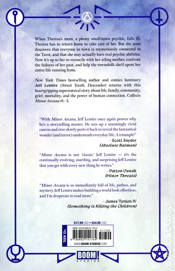 Volume 1 - 2nd and later printings. Collects Minor Arcana (2024 Boom) #1-5. Story and art by Jeff Lemire. Theresas mother has fallen ill, and as a young bitter misanthrope, returning to her hometown to take care of her phony psychic of a mom is the last thing on Theresas bucket list. But when Theresa finds out these abilities might be real after all, it will up to her to reconcile with her ailing mother, confront the failures of her past, and help the townsfolk shed spent her life running from not so long ago… New York Times bestselling author Jeff Lemire (Descender, Black Hammer), garnering Eisner, Harvey, and Ignatz Awards and nominations for both written and illustrated works, as well as working with top talent like Andrea Sorrentino, Gabriel H. Walta, and Dustin Nguyen, debuts his first project at BOOM! Studios with this heart-gripping supernatural story about life, family, community, grief, mortality, and the power of human connection. Softcover, 144 pages, full color. Rated T+ Cover price $17.99.
