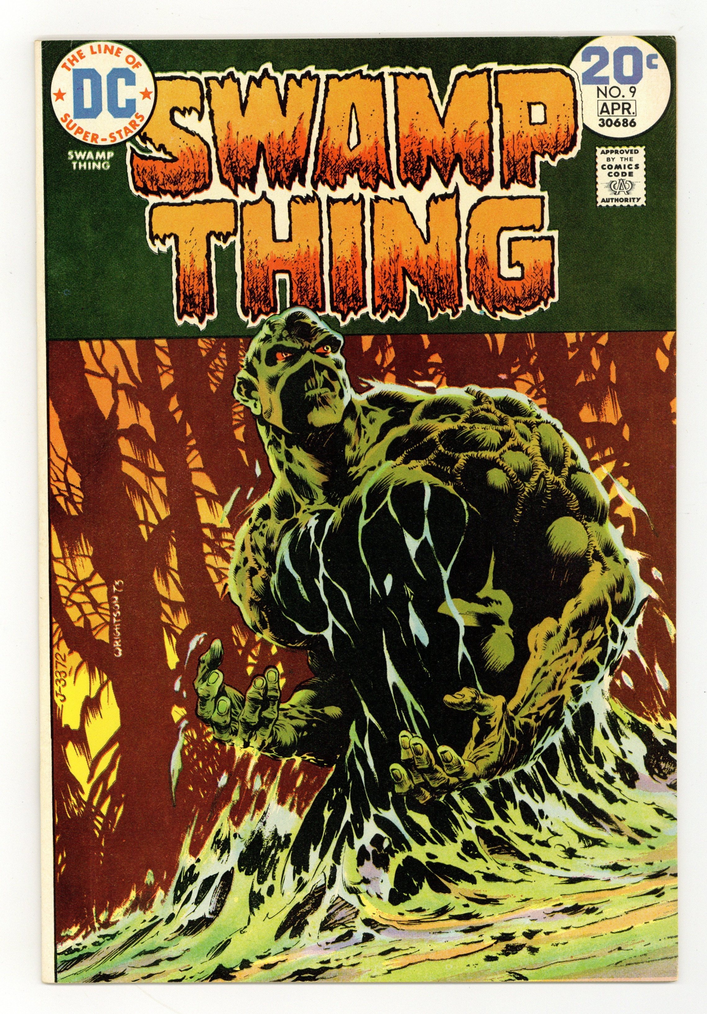 Starts Apr 4 "Dark Genesis." While working on a restorative formula (that can make forests out of deserts) in the Louisiana swamps, scientist Alec Holland is killed by a bomb set off by Mr. E., who wants the formula. Shortly thereafter, a humanoid plant being rises from the swamp, created from the body of Holland, the chemicals in the formula, and the strange forces in the swamp. 1st appearance of Alec and Linda Holland. 1st appearance of Matt Cable. (Swamp Thing himself first appeared in House of Secrets 92). Script by Len Wein, art and cover by Berni Wrightson. Includes brief bios of Wein and Wrightson. Cover price $0.20.
