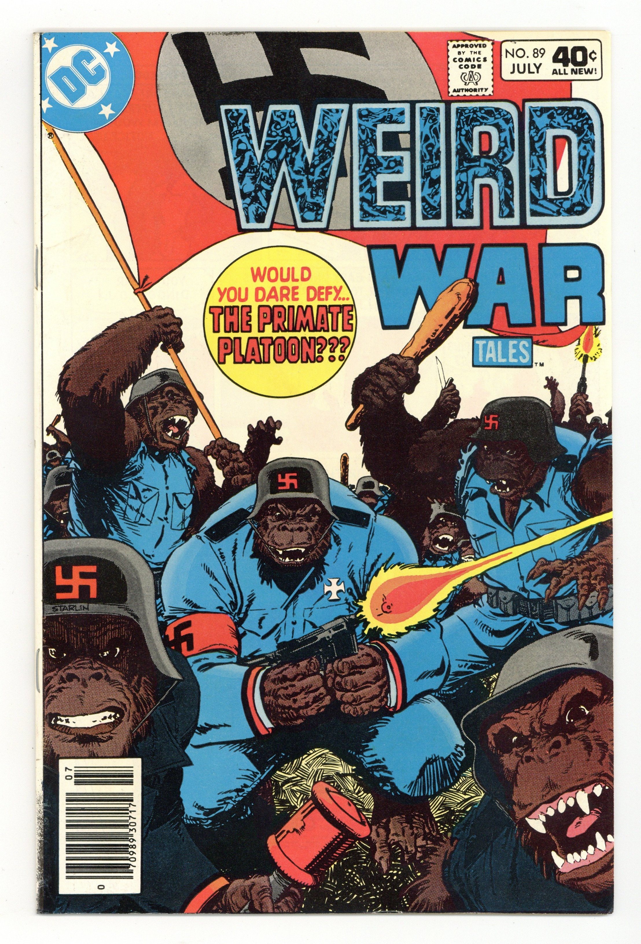 Starts Apr 27 Cover art by Jim Starlin. One page of art by Romeo Tanghal. Primate Patrol, script by George Kashdan, pencils by Ken Landgraf, inks by Dave Simons; set in Africa during World War II. This Ship Shall Be Your Coffin, script by George Kashdan, art by Ric Estrada; set in May 1942 in the Battle of the Coral Sea during World War II. Death the Dread Drummer, script by Robert Kanigher, art by Ruben Yandoc [as Rubeny]; set in summer 1917 on the Western Front during World War I. Death does not host but appears as "Death the Dread Drummer." 32 pgs. $0.40. Cover price $0.40.