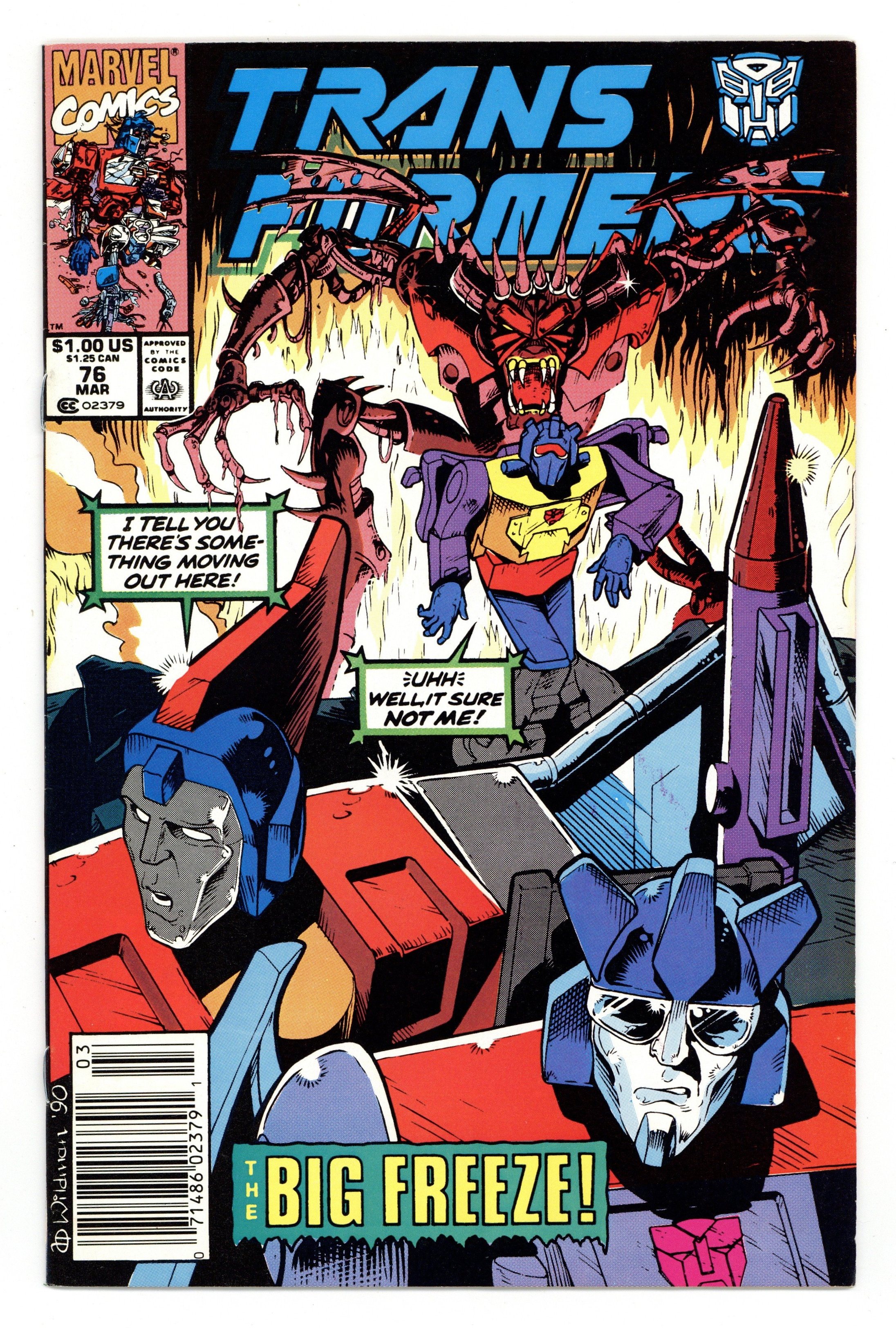 Starts Apr 4 Newsstand Edition. Cover by Herb Trimpe, Ian Akin, and Brian Garvey. Written by Bob Budiansky, art by Ian Akin, Brian Garvey, and others. Character profiles, ablities, and weaknesses of Autobots and Decepticons from Groove to Ramjet. Includes: Groove; Headstrong; Hoist; Hook; Hot Spot; Hound; Huffer; Inferno; Ironhide; Jazz; Jetfire; Kickback; Laserbeak; Long Haul; Megatron; Menasor; Metroplex; Mirage; Mixmaster; Motormaster; Octane; Omega Supreme; Onslaught; Optimus Prime; Outback; Perceptor; Pipes; Powerglide; Predaking; Prowl; Ramhorn; and Ramjet. 40 pgs., full color. $1.25. Cover price $1.25.