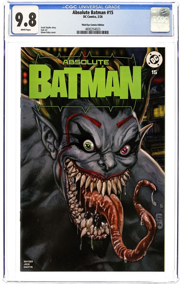 Starts Apr 27 Third Eye Comics Exclusive Variant Cover by Glenn Fabry. Story by Scott Snyder. Art by Jock. SCOTT SNYDER REUNITES WITH LEGENDARY ARTIST JOCK! Alfred reveals to Bruce the story of the man he's been chasing for years. Enter: Joker! Scott Snyder and Jock reunite for an epic tale in the Absolute Universe! 32 pages, full color, rated 15+.