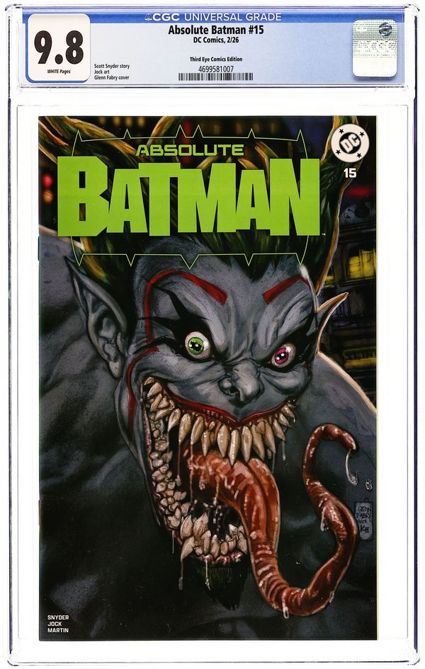 Starts May 11 Third Eye Comics Exclusive Variant Cover by Glenn Fabry. Story by Scott Snyder. Art by Jock. SCOTT SNYDER REUNITES WITH LEGENDARY ARTIST JOCK! Alfred reveals to Bruce the story of the man he's been chasing for years. Enter: Joker! Scott Snyder and Jock reunite for an epic tale in the Absolute Universe! 32 pages, full color, rated 15+.
