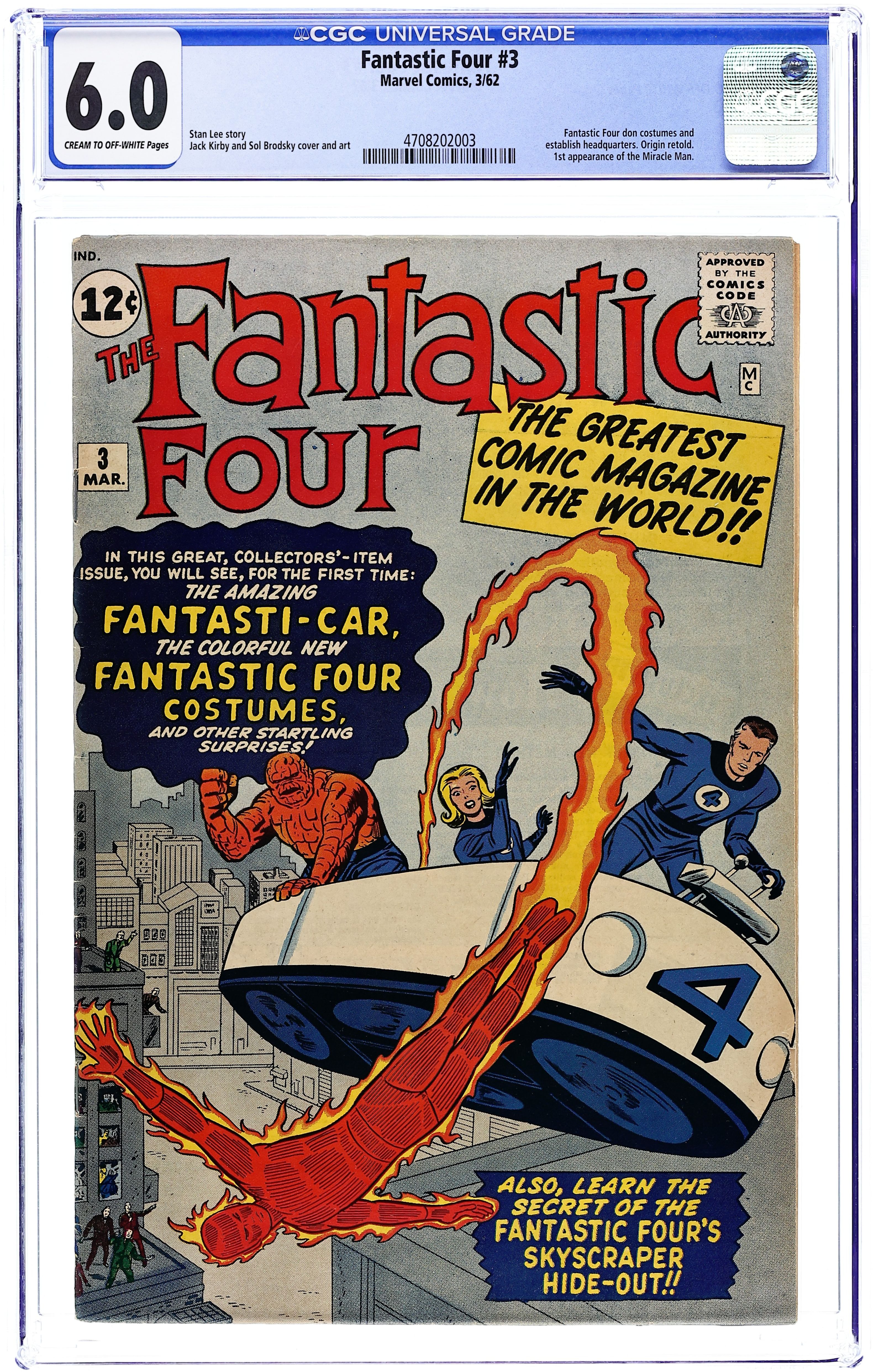 Starts Apr 4 First 12-cent issue. Cover pencils by Jack Kirby, inks by Sol Brodsky. First appearance of the Miracle Man in "The Menace of the Miracle Man!", script by Stan Lee, pencils by Jack Kirby, inks by Sol Brodsky; The Miracle Man performs his super-villain debut at his magic show by humiliating the Thing. Johnny Storm the Human Torch! Pin-Up Page, pencils by Jack Kirby, inks by Sol Brodsky. Chapter II "The Monster Lives!"; Miracle Man declares war on humanity and animates a movie monster statue. Chapter III "The Flame that Died!"; Human Torch torches the animated Monster from Mars-statue and Invisible Girl stowes away on the atomic tank that Miracle Man has stolen. Chapter IV "In the Shadow of Defeat!"; The Thing recalls the origin of the Fantastic Four while the Invisible Girl is taken prisoner by Miracle Man. Chapter V "The Final Challenge!" This issue features the first appearances of the FF costumes and the Fantasticar. First FF letters page; letter to the editor from comics artist Alan Weiss. (For the original, unused Kirby/Dick Ayers cover to this issue, see Fantastic Four 224.) 36 pgs. $0.12. Cover price $0.12.