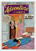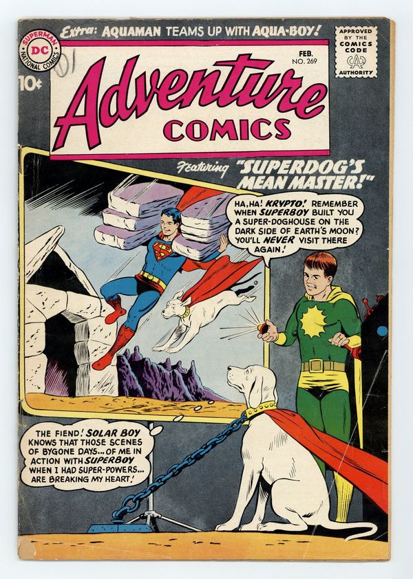 Starts Apr 27 Cover pencils by Curt Swan, inks by Shelly Moldoff. 1st appearance of Aqualad in Aquaman series in The Kid from Atlantis! Krypto's Mean Master!, script by Jerry Siegel, art by George Papp; Krypto searches for a new master after Superboy punishes him, with disastrous results. Green Arrow and Speedy (last story in Adventure Comics) in The Comic Book Archer! in which the editor at a fictitious comics publisher, All-Star Comics, explains how comics are made. "Ghost, Mr. Sloan," Speedy tells the editor, "As the editor of All Star Comics, you must do a terrific amount of work!" to which the editor replies, "But it's fun, Speedy! I discuss the stories with writers, review the art-work, and let our production manager do the rest!". 36 pages, Full Color. Cover price $0.10.