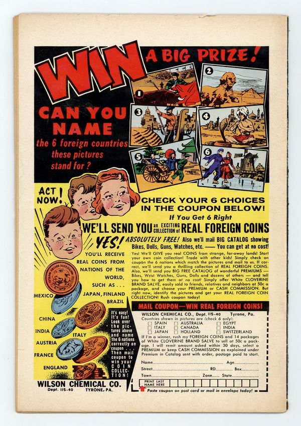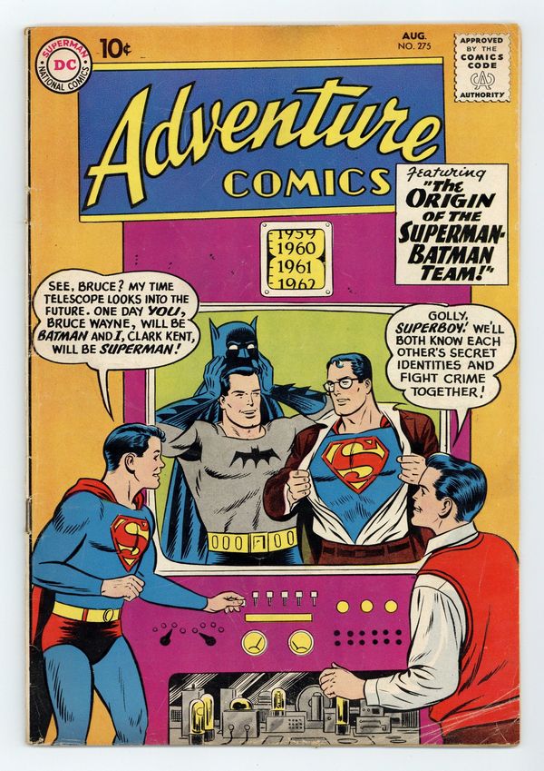 Starts Apr 27 Cover pencils by Curt Swan, inks by Stan Kaye. The Origin of the Superman-Batman Team!, script by Jerry Coleman, art by George Papp; The Wayne family moves to Smallville and young Bruce Wayne assumes the identity of the Flying Fox, helping Superboy fight crime. House ad for Superman Annual #1. Champion of the World starring Congorilla, script by Robert Bernstein, art by Howard Sherman; Congo Bill and his gorilla alter ego help a boxer regain his self-confidence in the ring. The Interplanetary Mission! starring Aquaman, script by Robert Bernstein, art by Ramona Fradon. 36 pages, Full Color. Cover price $0.10.