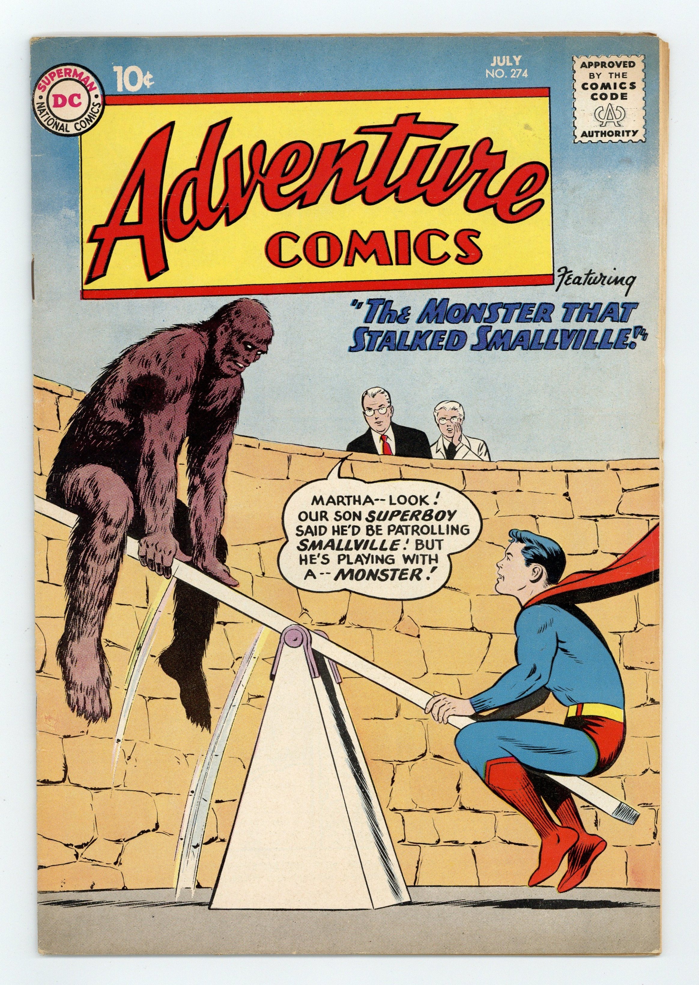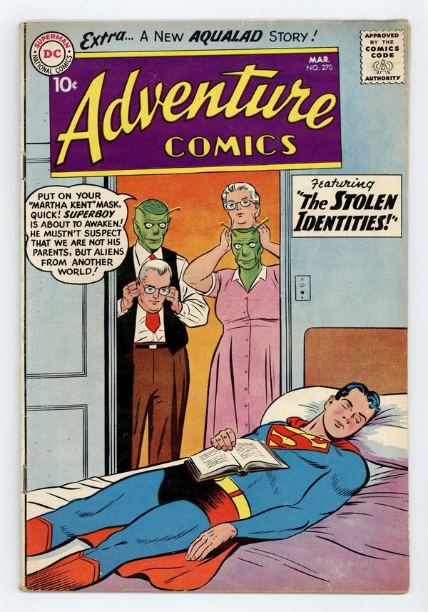 Starts Apr 27 Cover pencils by Curt Swan, inks by Stan Kaye. The Stolen Identities, script by Jerry Siegel, art by George Papp; Two Xelthunians secretly replace Ma and Pa Kent to perform a secret mission, not knowing that the Kents are Superboy's foster parents; After Ma Kent unwisely mentions Superboy's vulnerability to kryptonite, the Xelthunians power the transporter ray they plan to use to send Superboy to their planet with red kryptonite and it turns him into a fat Boy of Steel, a bullet-sized Boy of Steel, and a giant Boy of Steel. The Ninth Wonder starring Congorilla, script by Robert Bernstein, art by Howard Sherman; In his Adventure Comics debut, Congorilla stops river pirates, frees a kidnapped scientist, and stops an attack by the Wambus, all before a retelling of his origin. Casey the Cop humor page by Henry Boltinoff. The Menace of Aqualad! starring Aquaman, script by Robert Bernstein, art by Ramona Fradon. 36 pages, Full Color. Cover price $0.10.
