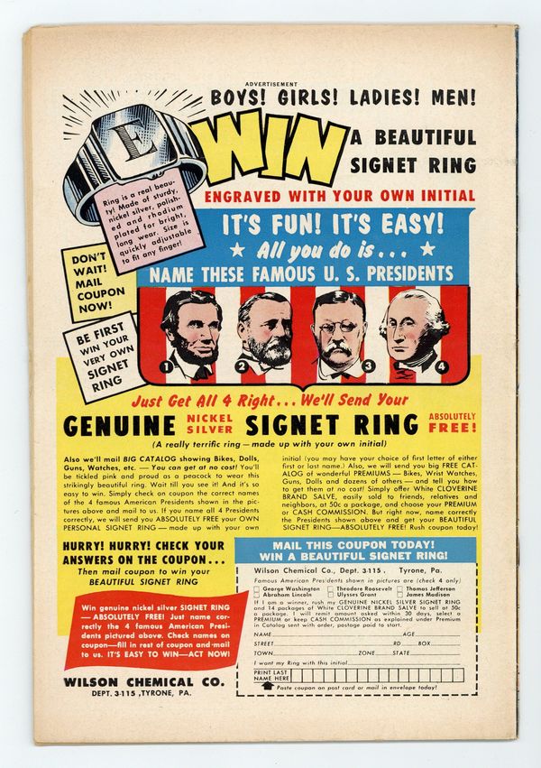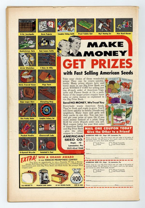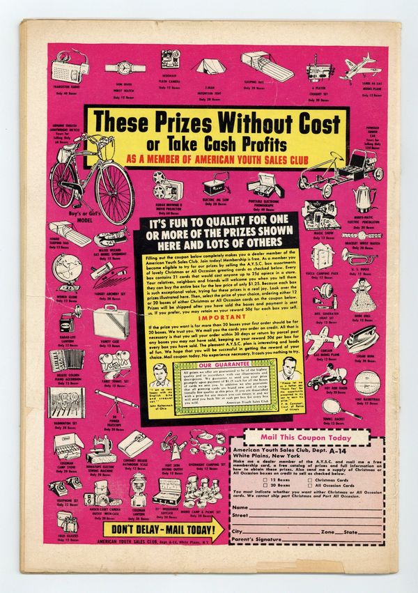 Ends Mar 30 7:09 PM CST Bid History 2 bids Current Bid $6 Your Secret Max Bid If you'd like to bid, please log in or register. Cover pencils by Curt Swan, inks by Stan Kaye. "The War between Jimmy Olsen and Superman!", script by Alvin Schwartz, pencils by Curt Swan, inks by Stan Kaye; A criminal from Kandor switches places with Jimmy Olsen and forces Superman to reveal the location of his Fortress of Solitude, so he can destroy the bottled city; But scientists in Kandor reverse the switch just in time. 2/3-page Tricksy, World's Greatest Stunt Man story by Henry Boltinoff. "The Secret of the Super-Orphan!", script by Otto Binder, art by Jim Mooney; Supergirl helps Timmy get adopted by assisting with his magic show using her super powers. "The Destroyer of Congo Bill!", script by Jack Miller, art by Howard Sherman. 36 Pages, Full Color. $.10 Cover price $0.10.