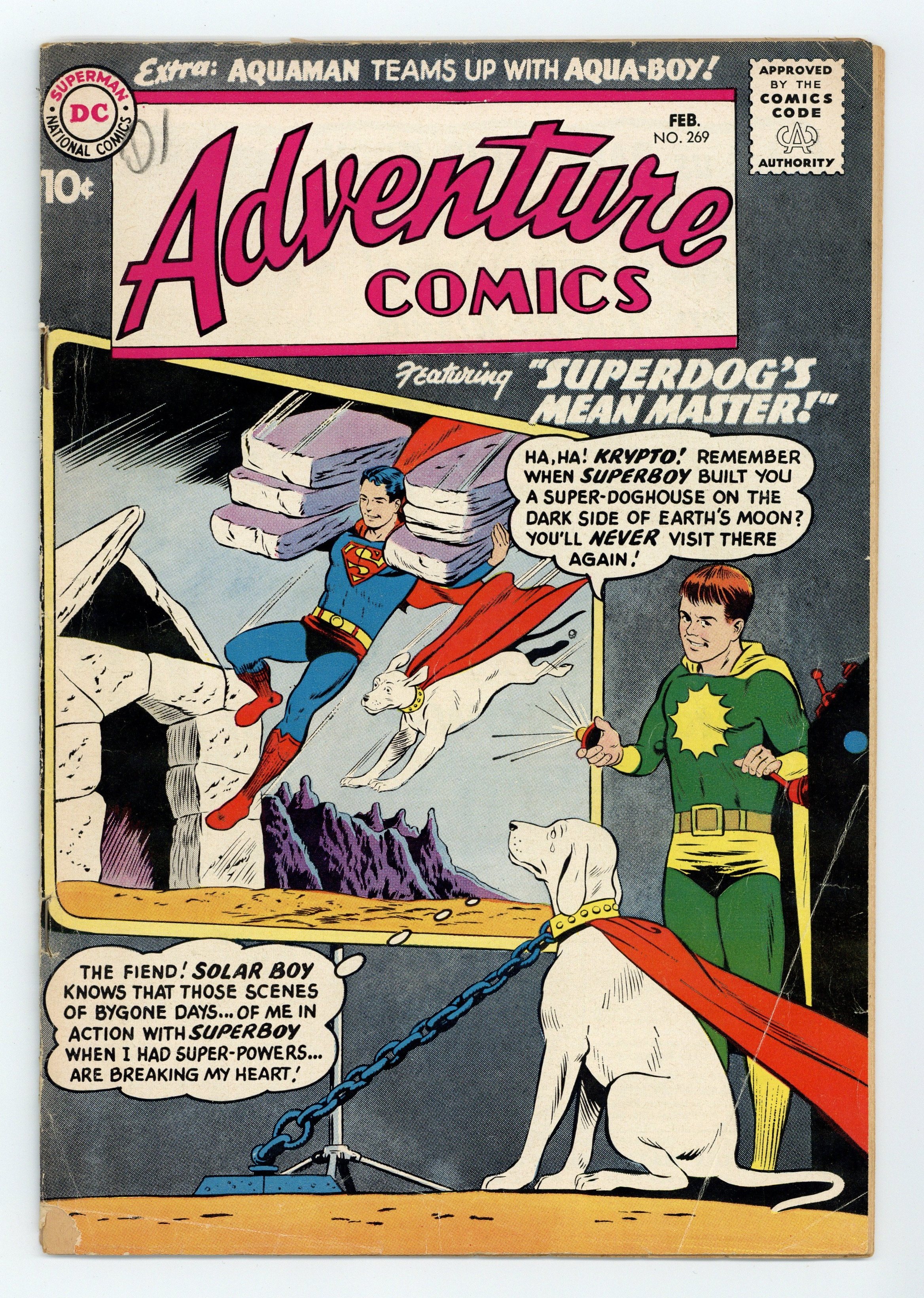 Starts Apr 20 Cover pencils by Curt Swan, inks by Stan Kaye. The Colossal Superdog, script by Otto Binder, art by George Papp; A glowing purple meteor turns Krypto into a colossal superdog. The Undersea Hospital!, art by Ramona Fradon; Aquaman opens an undersea hospital to help his undersea friends. The World's Worst Archer!, script by Robert Bernstein, art by Lee Elias; Chief Brave Bow helps Roy Harper become Green Arrow's new partner. 36 pages, Full Color. Cover price $0.10.