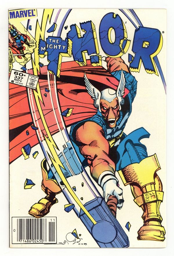 Ends Mar 30 9:46 PM CST Bid History 7 bids Current Bid $83 Your Secret Max Bid If you'd like to bid, please log in or register. Newsstand Edition. Cover by Walt Simonson. Beta Ray Bill (first appearance) becomes Thor in "Doom!", script and art by Walt Simonson; Nick Fury asks Thor's aid in investigating an alien ship heading for earth; Thor arrives and triggers the awakening of an alien protector, Beta Ray Bill; Bill bests Thor and takes up his hammer only to be accidentally summoned to Asgard by Odin who thinks he is summoning Thor. Brief appearances by Nick Fury, Loki, Sif, Balder, Heimdall, Volstagg, and Odin. First appearance of Lorelei (sister of the Enchantress). Begins Walt Simonson's run on Thor (through #382). Bullpen Bulletins. Star Frontiers TSR ad. 36 pgs., full color. $0.60. Cover price $0.60.