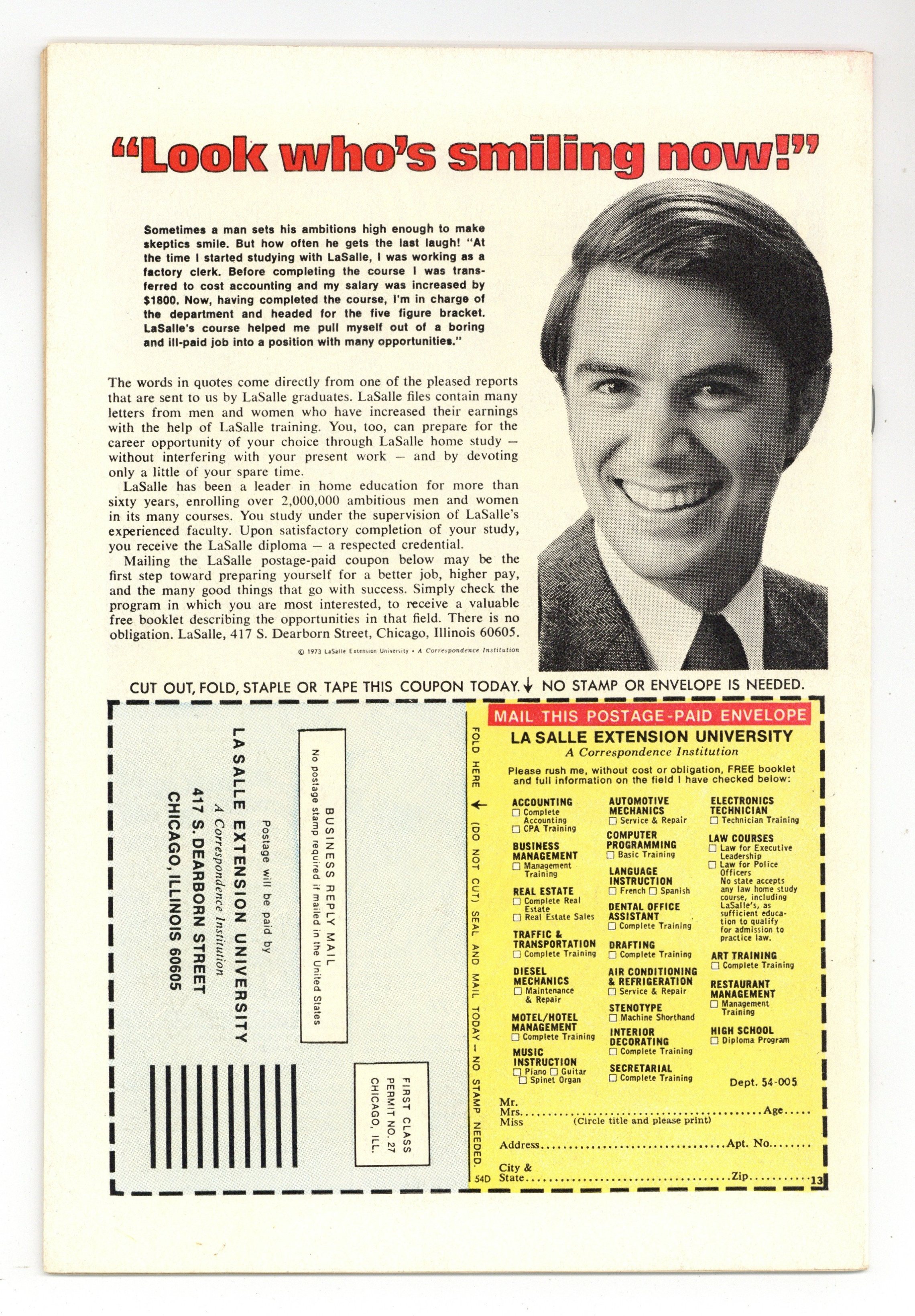 Starts Apr 20 Cover pencils by John Buscema and Marie Severin (layout, alterations). "One God Must Fall!", script by Stan Lee, pencils by Neal Adams, inks by Joe Sinnott; Trapped in Loki's body, Thor has been banished to Hades and made prisoner of Mephisto, sending Sif and the Warriors Three to his rescue; They attempt to save Thor, however Mephisto's magical powers and legions of demonic creatures prove too much for them; Taking advantage of the fact that he has access to Loki's magical might, Thor focuses this power to free himself from the block of ice that Mephisto had frozen him into; Thor then challenges Mephisto, who boasts that Loki is on Earth ruining his good name; Thor battles Loki, hoping that his half-brother can be separated from the mystic hammer in his hands; When the opportunity presents itself, Thor charges at Loki and lets him pummel him; As Thor had hoped, when the 60 second time limit that Thor's body can be separated from his hammer had come to pass, Loki's body reverts back into the form of Donald Blake which then causes the body-switch to reverse itself restoring Thor back to his own body. 36 pgs., full color. $0.15. Cover price $0.15.